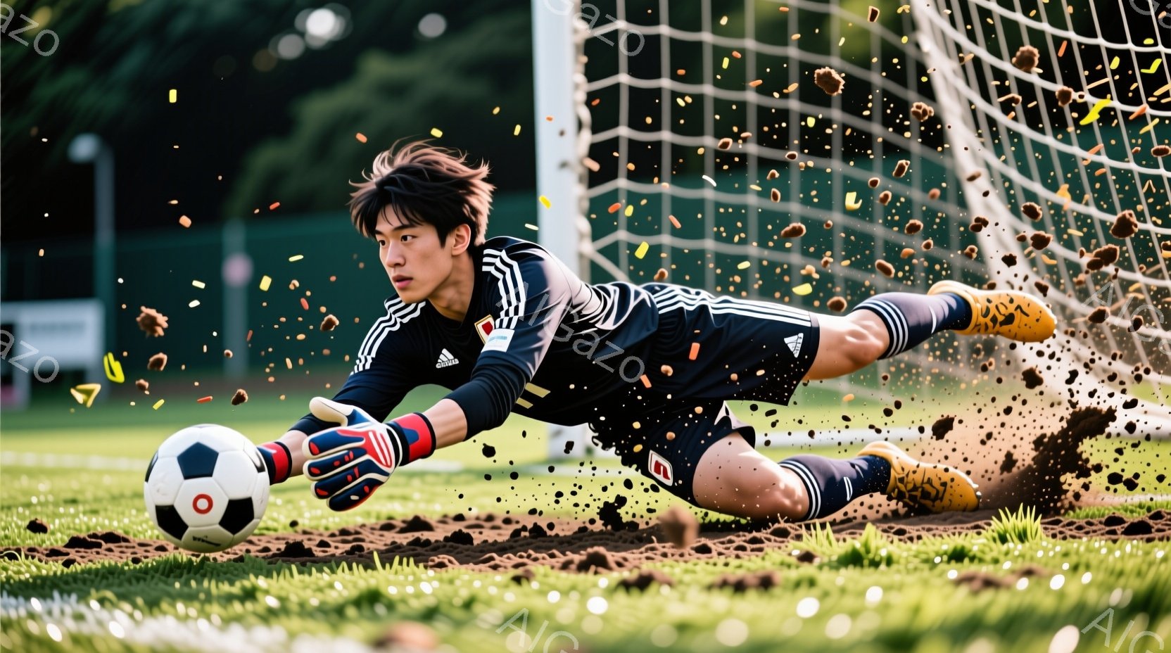 ゴールキーパーが激しいタックルでボールを阻止しようとしている瞬間を捉えた写真です。彼は紺色の長袖ユニフォームと黒いショートパンツを着用し、鮮やかな青色のソックスとスパイクを履いています。背景には緑の芝生とネット、そしてぼやけた建物が見え、ダイナミックな動きと土埃が躍動感を演出しています。