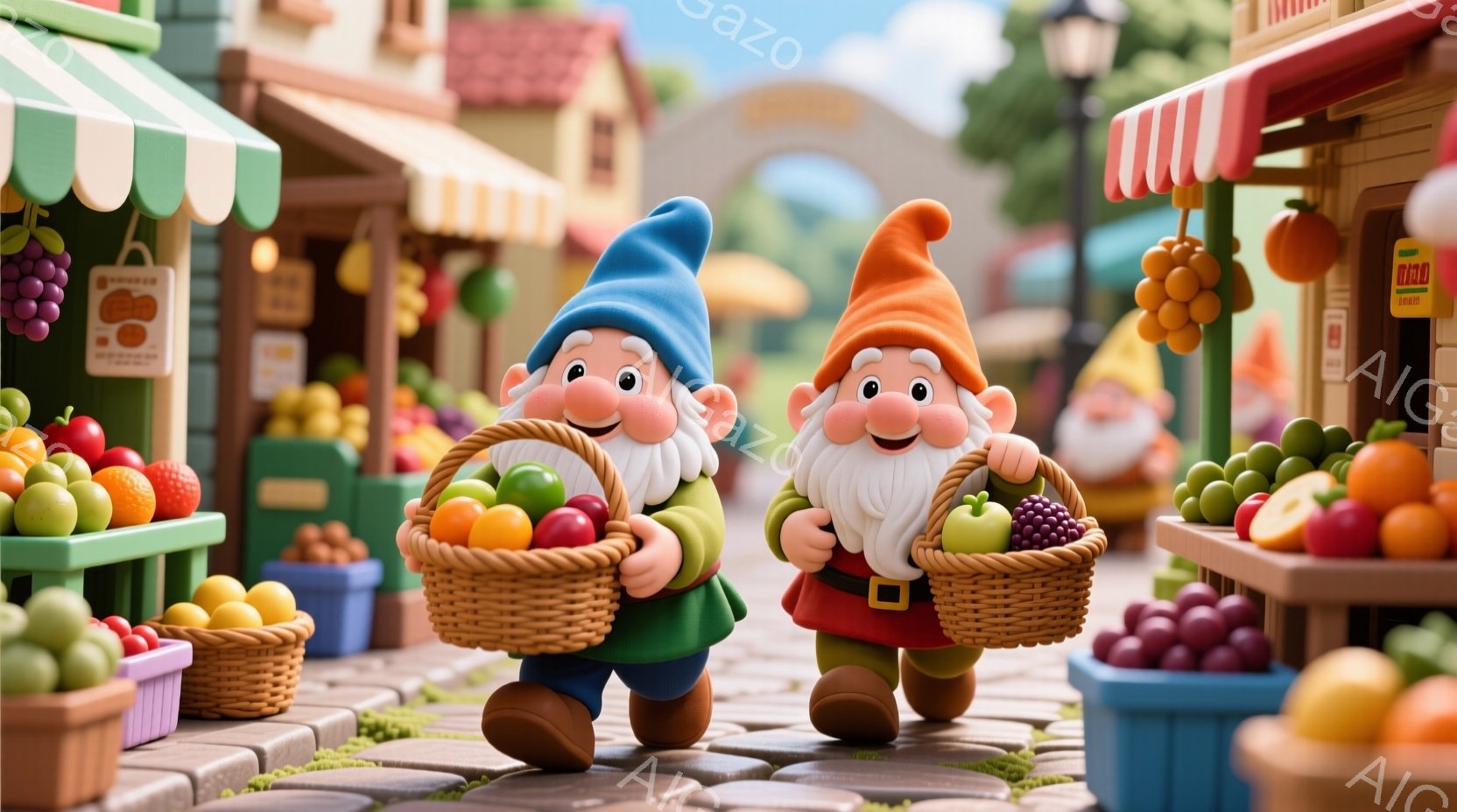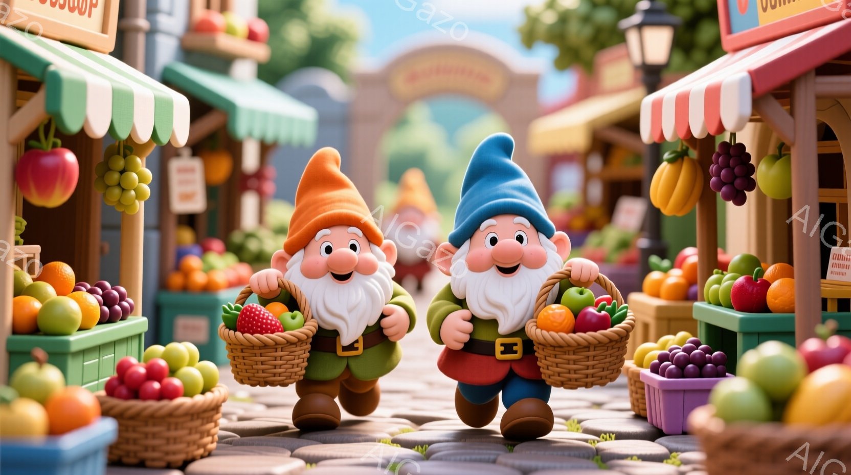 可愛らしい2人の小人が、それぞれ果物がたくさん入ったバスケットを抱えて歩いています。彼らは赤いシャツに緑色のズボン、そして特徴的な尖った帽子を被っており、満面の笑みを浮かべています。背景には、カラフルな果物や野菜を並べた市場の屋台が並び、遠くにはアーチ状の入り口と緑豊かな自然が見え、明るく楽しい雰囲気を醸し出しています。