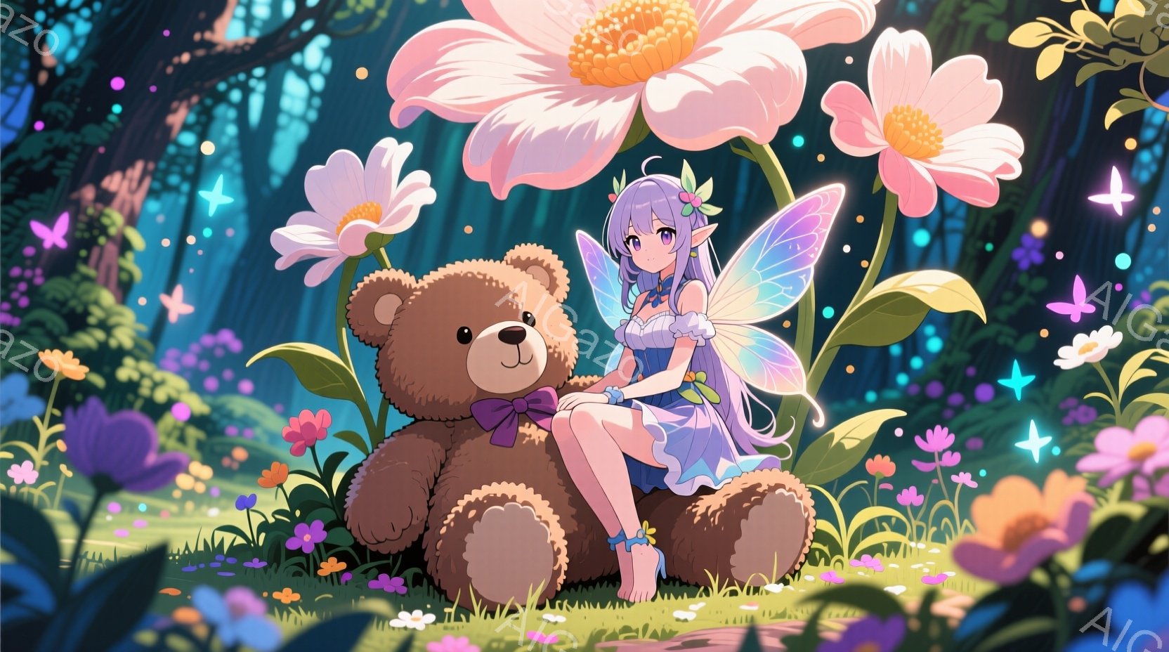 明るい緑の草原に大きなテディベアが座っており、ピンク色の髪と羽を持つ可愛らしい女の子がその上に座っています。彼女は緑色のドレスを着ており、微笑んでおり、周囲には色とりどりの花々が咲き乱れ、幻想的な雰囲気を醸し出しています。背景には木々が生い茂り、小さな光が舞い、まるで魔法のような世界を描写しています。