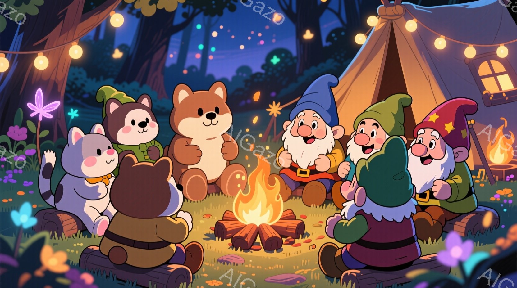 小さな焚き火を囲んで、帽子をかぶった小人たちが笑顔で座っている。中央には、リボンを付けたクマのぬいぐるみもおり、皆で温かい時間を過ごしているようだ。背景にはテント、草花、そして夜空に輝く星が描かれており、幻想的で心温まる雰囲気を醸し出している。