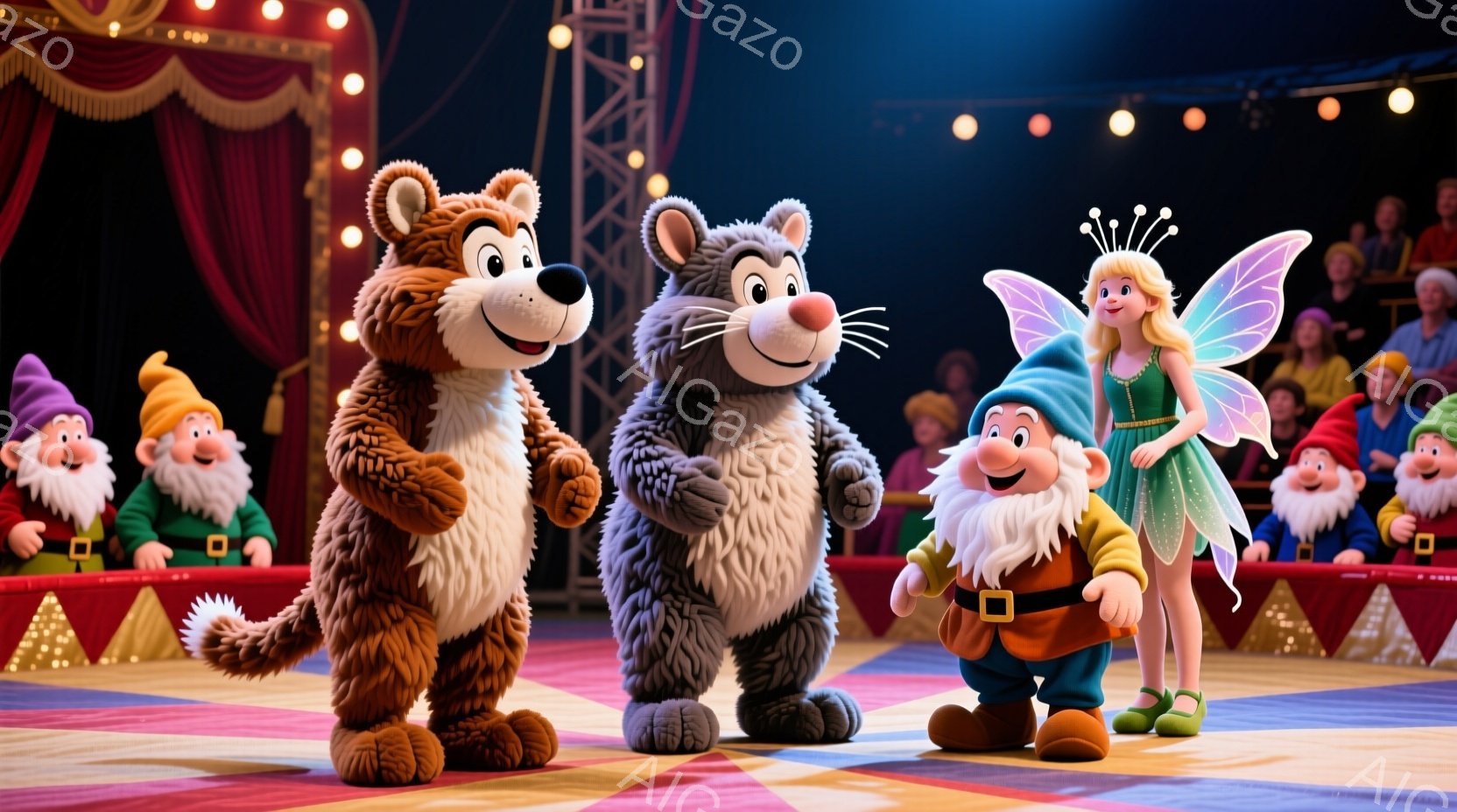 舞台の上には、茶色と黒のクマのキャラクターと、赤い帽子と服を着た3人の小人が立っています。クマたちは小さな羽を持っており、それぞれ笑顔で手を広げています。背景には、観客席と赤い模様の背景があり、サーカスのような華やかで楽しい雰囲気です。