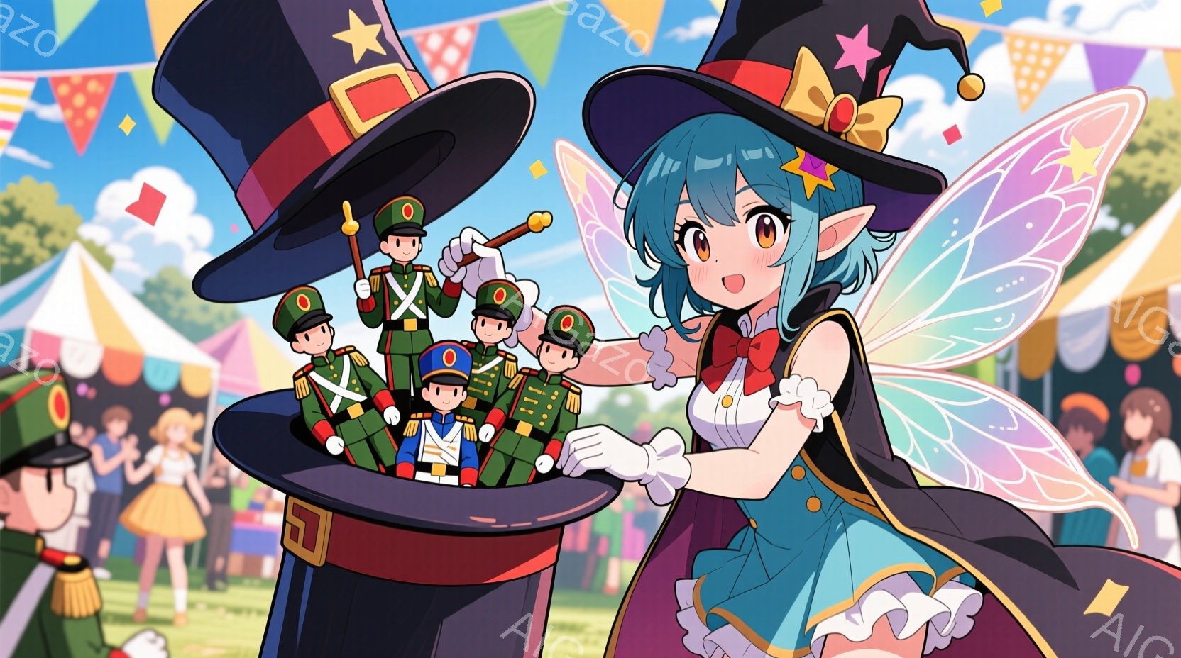 この無料AI生成画像「明るい金髪の巻き毛に、大きな蝶の羽を持つ女性が描かれています。彼女は黒と紫のフリル装飾が施されたドレスを着ており、マジックハットから軍服を着た兵隊の人形を取り出そうとしています。背景には、カラフルなテントや観客がおり、明るい日差しの中で賑やかな祭りの雰囲気が漂っています。」は、2025年10月26日に作成されました。 サイズは 1664×928px の高解像度で、商用利用も可能なフリー素材として提供しています。