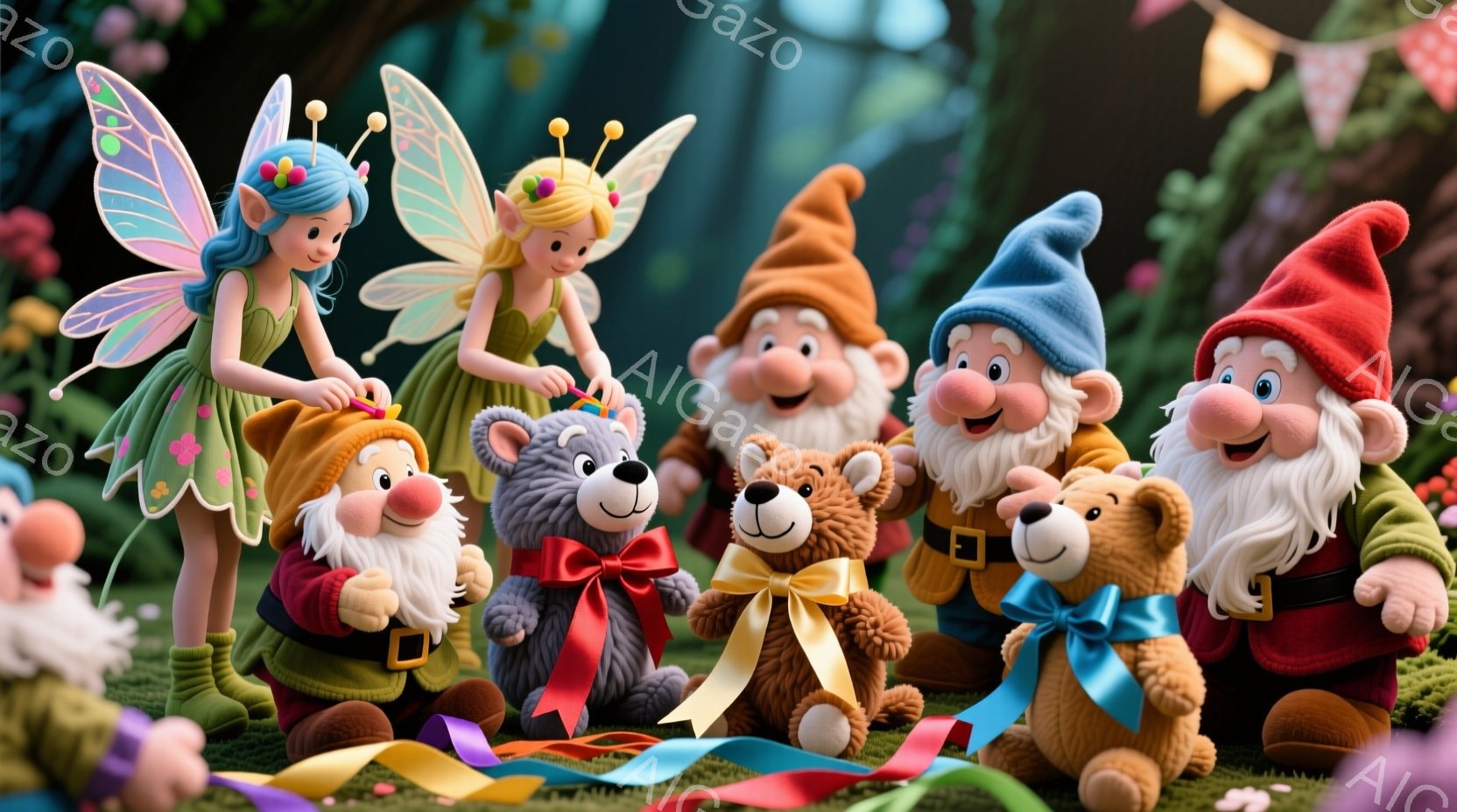 小さな妖精たちが、可愛らしいテディベアたちにリボンを結んであげています。妖精たちは緑色のドレスを着ており、それぞれ髪の色が異なり、顔には微笑みが浮かんでいます。背景には緑の芝生、小さな花々、そして遠くに見える小さな家や灯りがあり、幻想的で温かい雰囲気です。