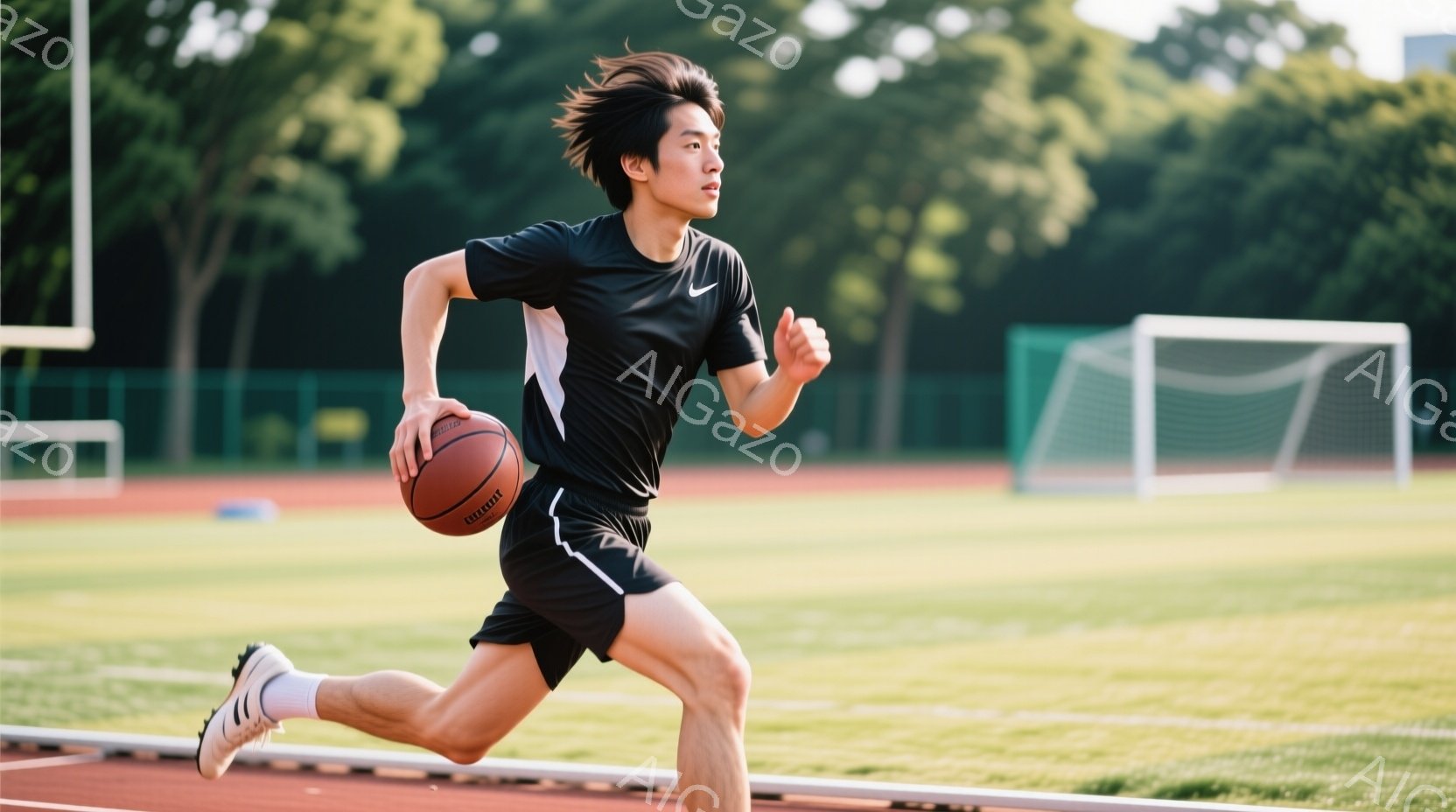 黒いタンクトップと黒い短パンを身につけた若い男性が、サッカーボールを持って走っている。彼は右方向に走り、やや伏し目がちで集中した表情をしている。背景には緑のフェンス、サッカーゴール、そして緑豊かな自然が見え、晴れた日の運動場の様子がうかがえる。