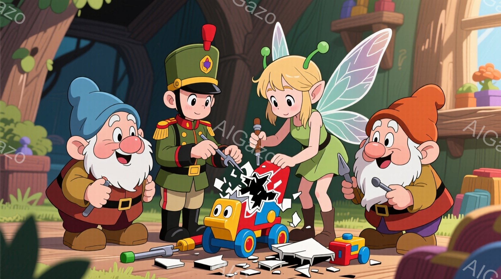 この無料AI生成画像「明るい緑の草原を背景に、おもちゃをバラバラにしている人々のグループを描いています。一人の男の子は兵隊風の服装で、赤いジャケットと黒いズボン、軍帽をかぶり、真剣な表情で何かを分解しています。妖精のような女性が彼を手伝い、周りにはおもちゃの車やブロックが散乱しており、全体的に活気があり楽しげな雰囲気です。」は、2025年10月26日に作成されました。 サイズは 1664×928px の高解像度で、商用利用も可能なフリー素材として提供しています。