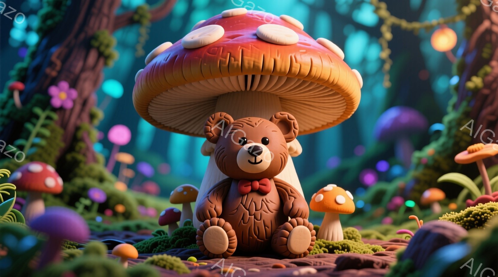 ぬいぐるみのようなテディベアが、大きな赤い水玉模様のキノコの傘の下に座っています。赤い蝶ネクタイを付けたベアは、穏やかな微笑みを浮かべ、可愛らしい表情をしています。背景は鮮やかな緑色の植物や様々な形のキノコで覆われたファンタジックな森で、まるで絵本のような雰囲気を醸し出しています。