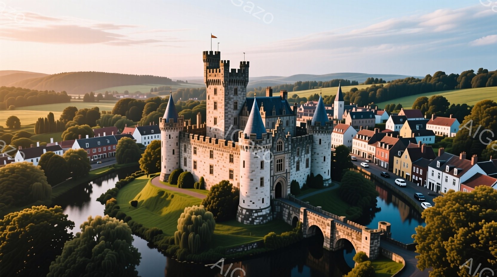 中世の城が曲がりくねった川の中にそびえ立ち、周囲には赤い屋根の家々が密集しています。緑豊かな丘と森林が背景に広がり、晴れた空の下、穏やかで絵画のような風景を作り出しています。城の塔は高くそびえ立ち、中世ヨーロッパの雰囲気を醸し出しています。