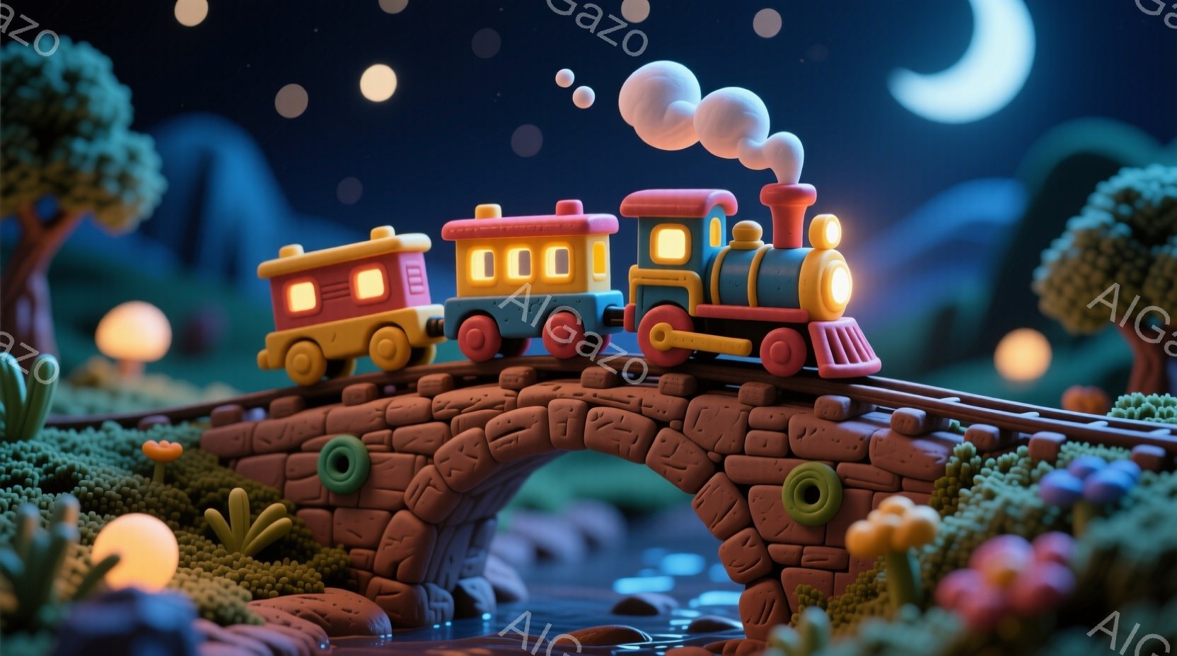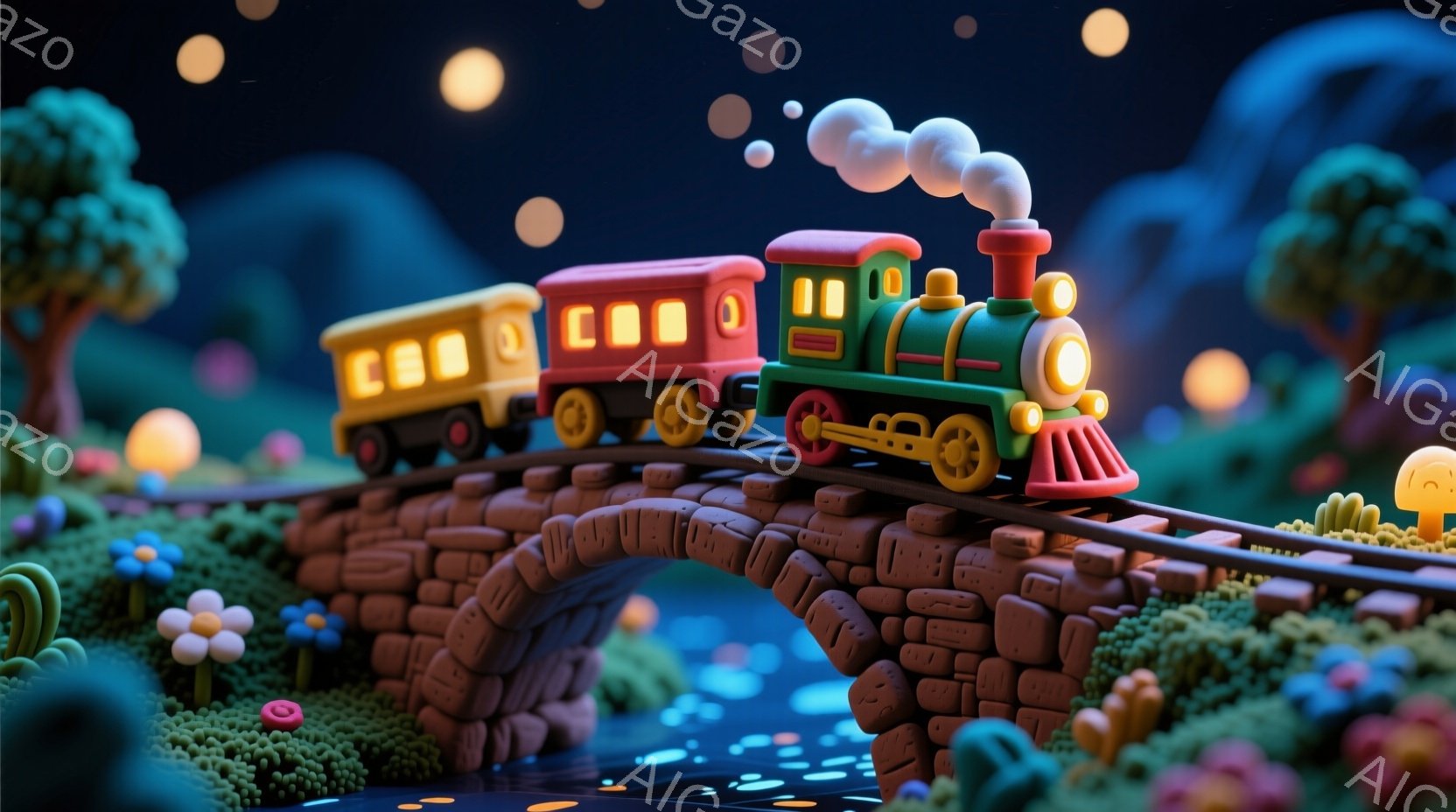 夜空の下、カラフルな蒸気機関車が石造りの橋の上を走っている様子が描かれています。機関車は赤、緑、黄色で構成され、可愛らしいデザインで、周囲には小さな灯りが点在し、ファンタジーのような雰囲気を作り出しています。背景には、緑豊かな植物と、小さく可愛らしい家々が見え、夢のような夜の風景が広がっています。