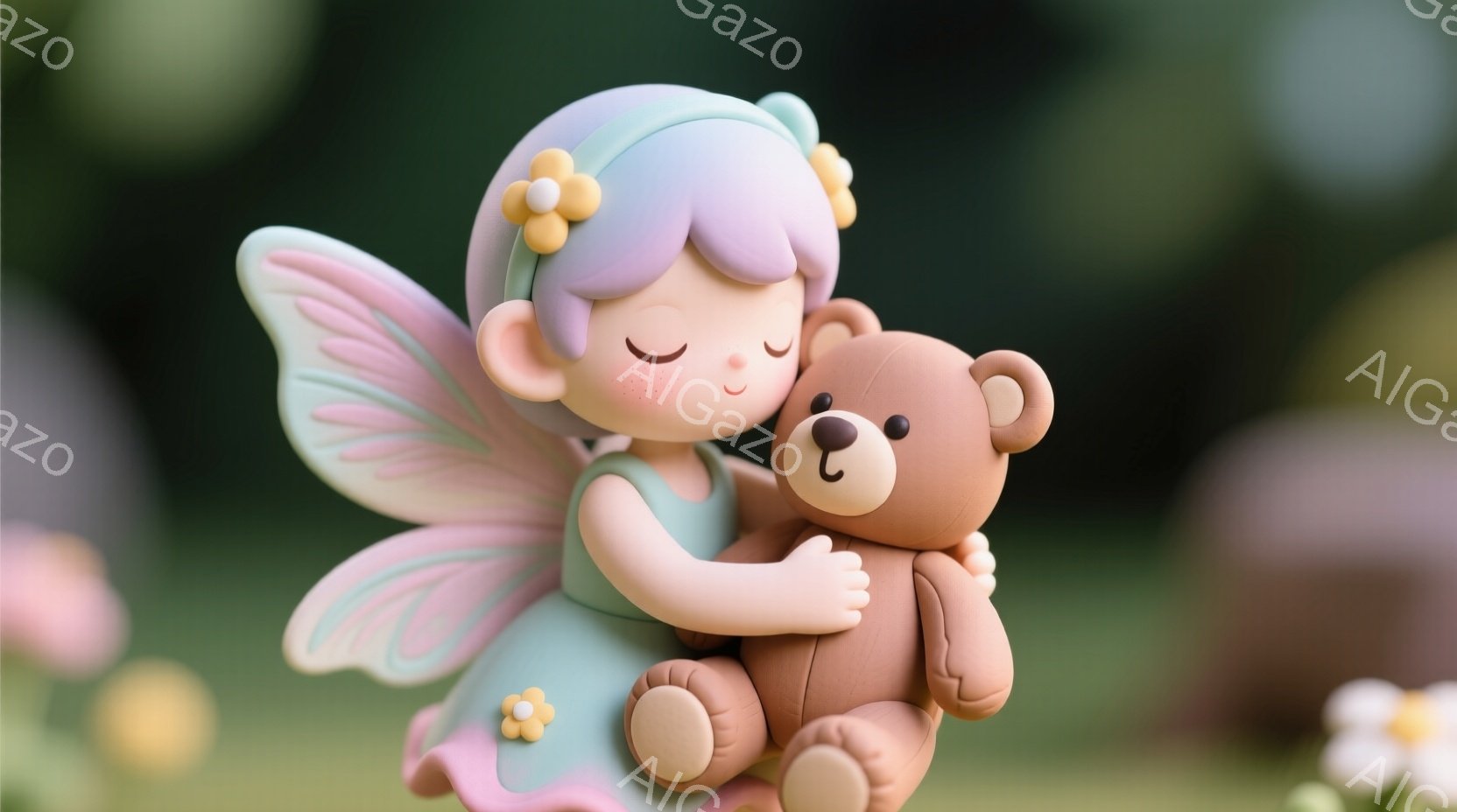 桃色の髪に花飾りをつけた少女が、薄い緑色のワンピースを着て、テディベアを抱きしめています。彼女は目を閉じて微笑んでおり、背景にはぼやけたピンクや白の花が咲き乱れているのが見えます。全体的に柔らかく、温かく、夢のような雰囲気です。