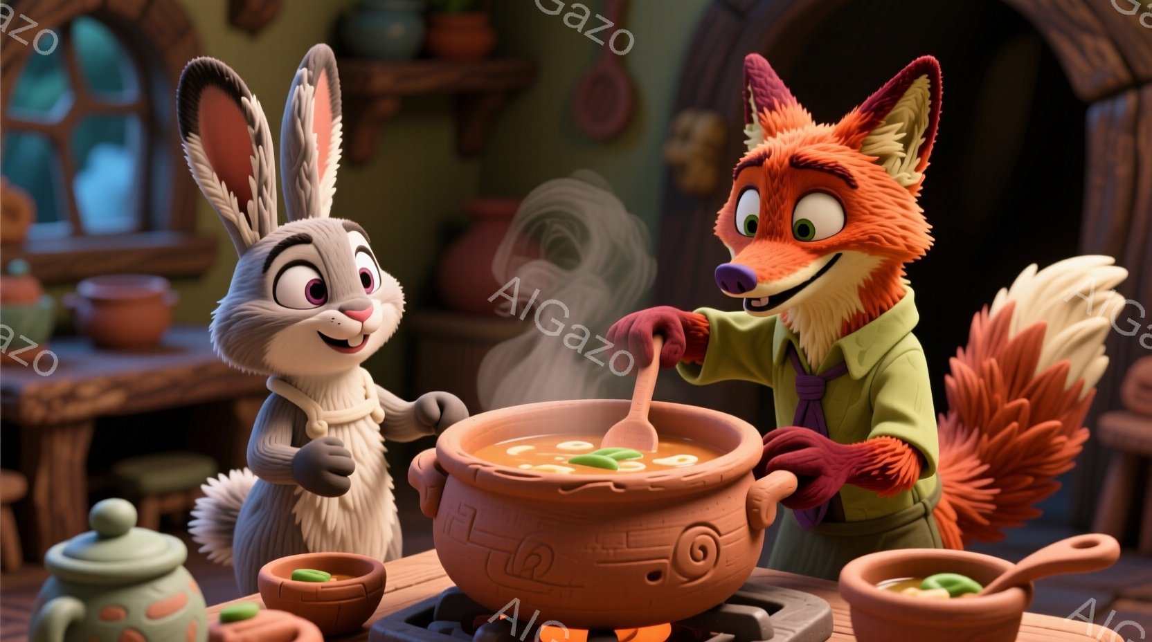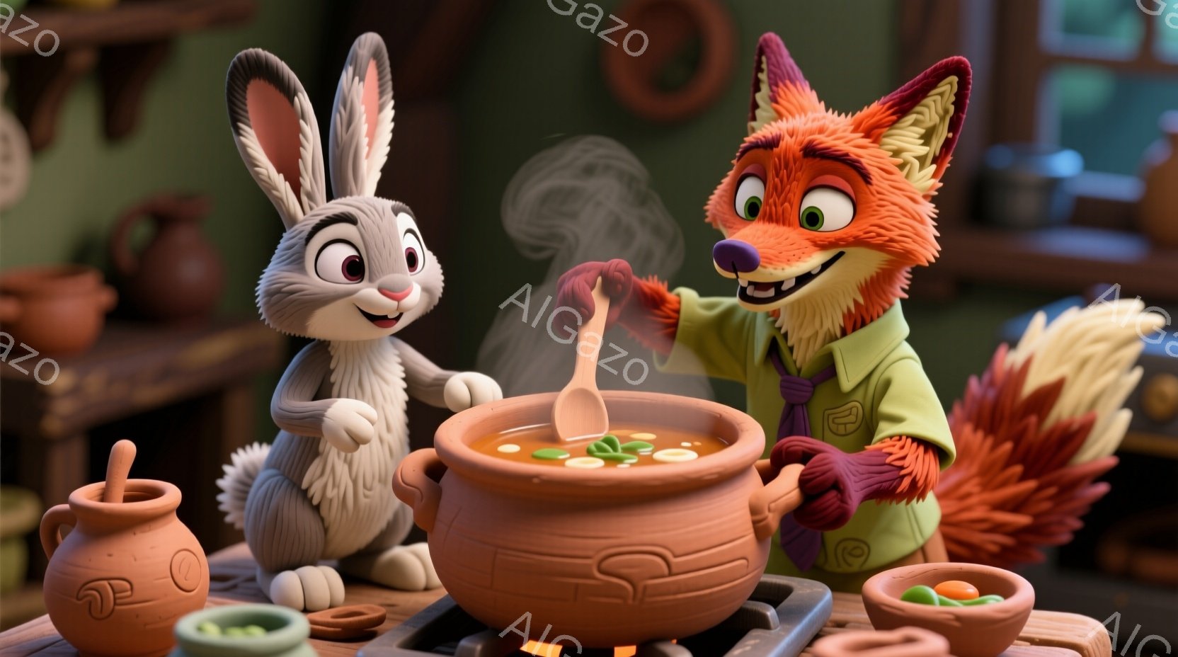 鮮やかな色彩のキッチンで、ウサギの女性とキツネの男性が料理を作っています。ウサギはエプロンを着ており、キツネは緑色の制服を着て、大きな鍋の中身を木べらでかき混ぜています。背景には陶器の壺や調理器具が並び、暖かく家庭的な雰囲気が漂っています。