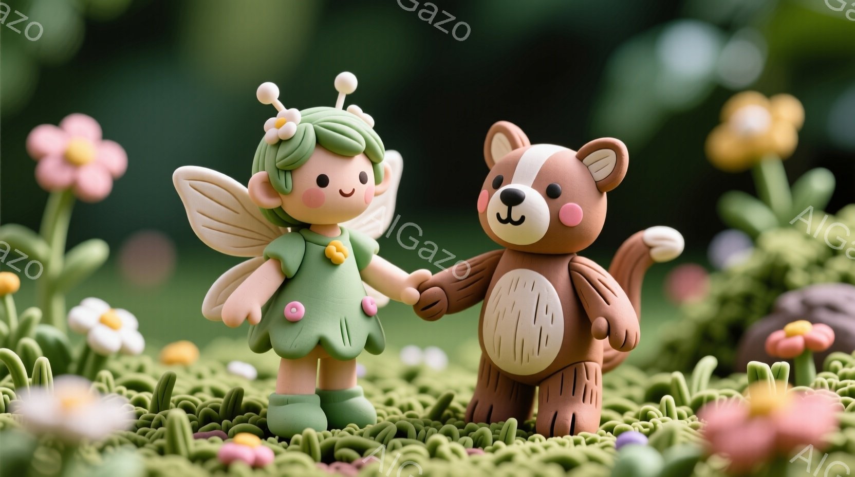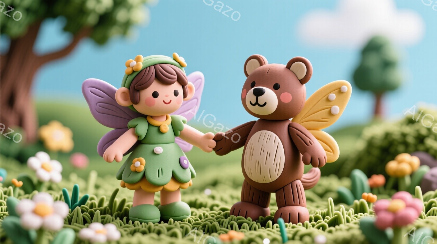 緑の芝生の上で、妖精の女の子と3匹のテディベアが手をつないで並んでいます。妖精は緑のドレスと羽、巻き毛の髪型をしており、笑顔で優しい表情です。背景には、可愛らしい家、木々、そして青い空が見え、全体的に温かく、遊び心のある雰囲気です。