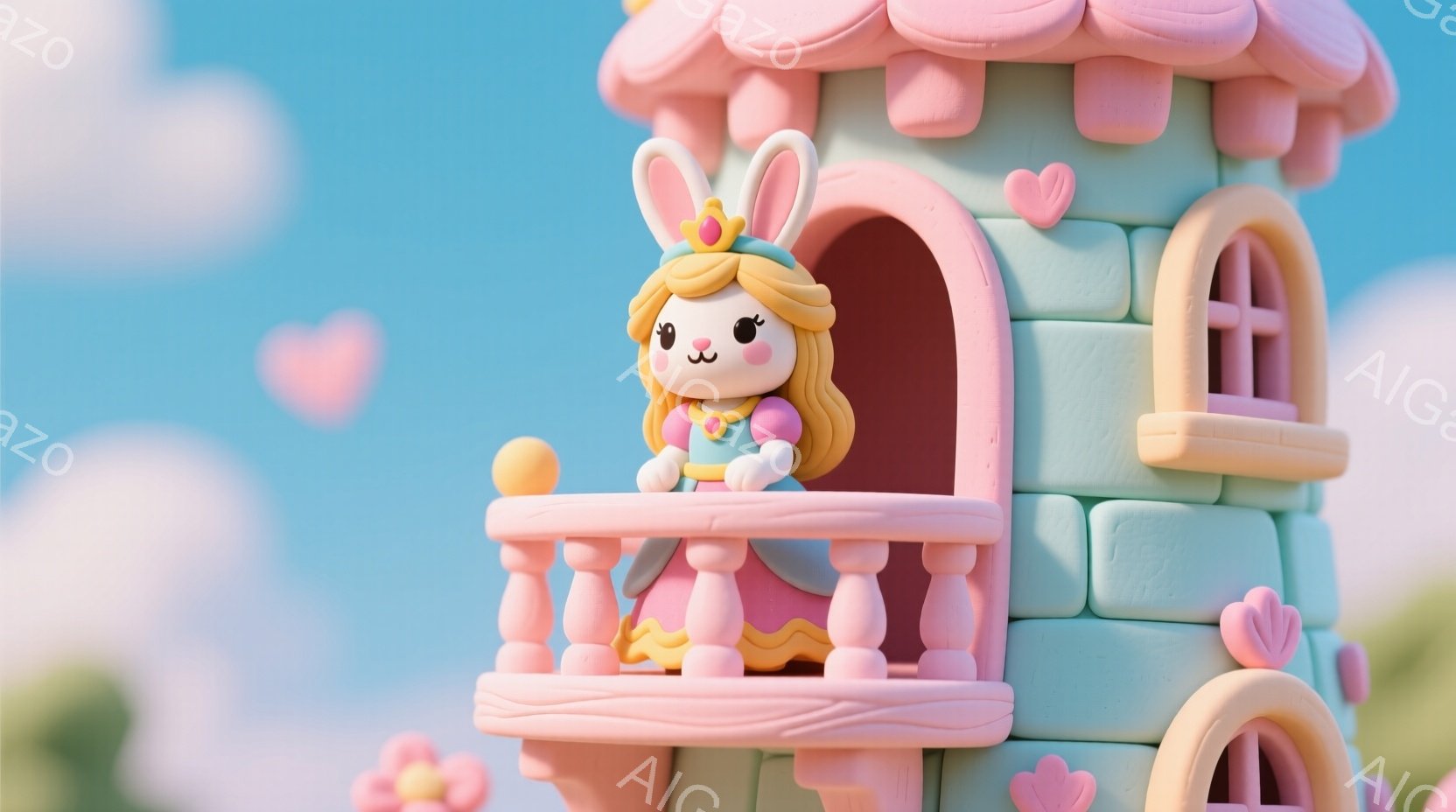 ピンクと水色のパステルカラーで構成された、おとぎ話のような可愛らしい世界が描かれています。ウサギの女の子がピンクのドレスとティアラを身につけ、バルコニーで穏やかな表情で立っています。背景にはパステルカラーの建物と、ふわふわとした雲が広がり、夢のような雰囲気を醸し出しています。