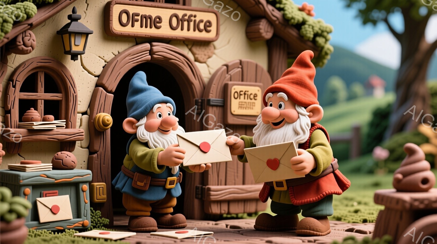 小さな可愛らしい家で、緑色の服と赤い帽子をかぶった妖精のような男が、別の妖精に赤いハートの付いた手紙を渡しています。背景には、様々な色の帽子をかぶった小さな妖精たちがおり、緑豊かな芝生と木々が広がっています。全体的に、暖かく、幸せで、おとぎ話のような雰囲気が漂っています。