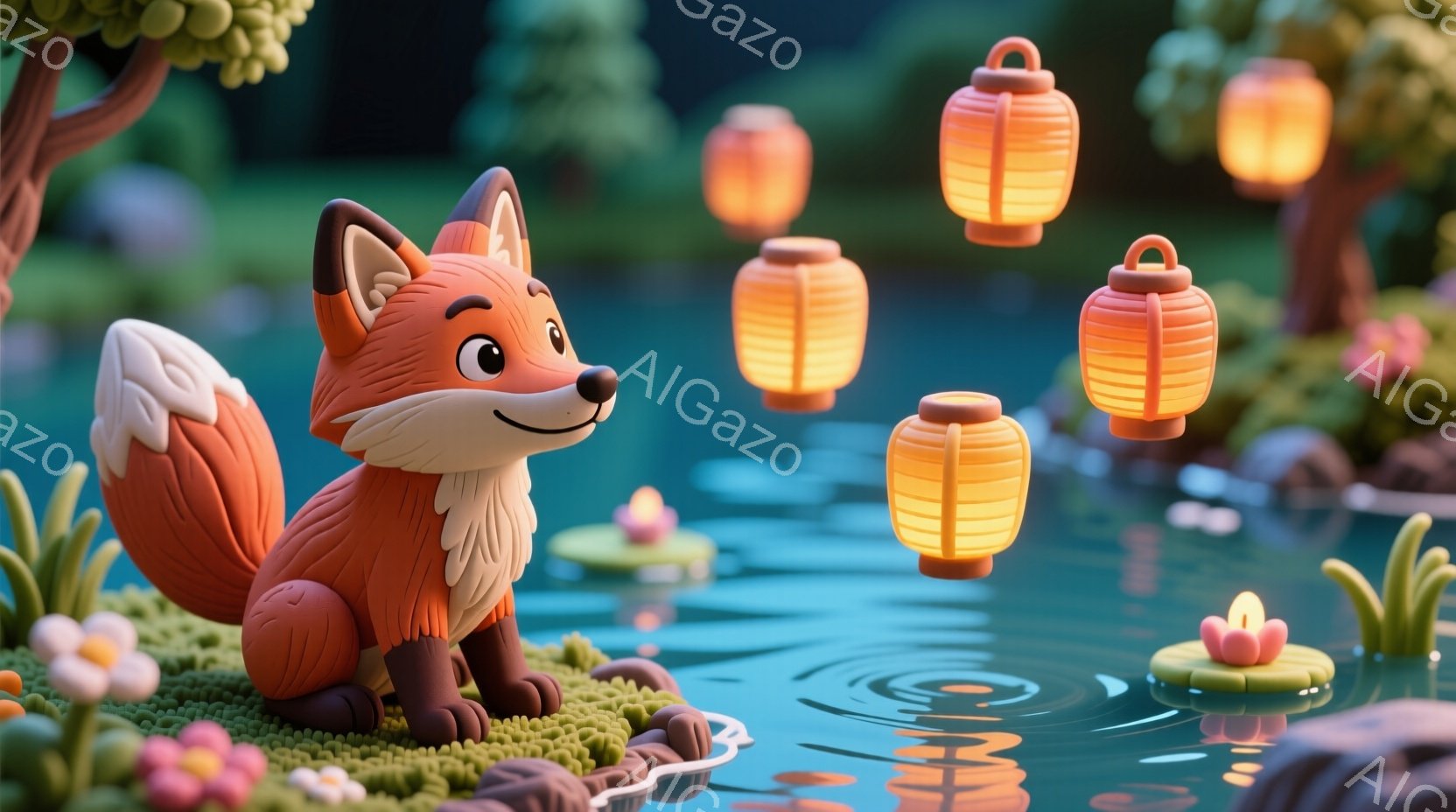 鮮やかなオレンジ色のキツネが、緑の苔むした土手に座ってこちらを見ている。水面には色とりどりの蓮の葉が浮かび、背景には様々な植物と、空中に浮かぶ提灯が点在し幻想的な雰囲気を醸し出している。全体的に温かく、可愛らしいイラストレーションで、平和で穏やかな印象を与える。