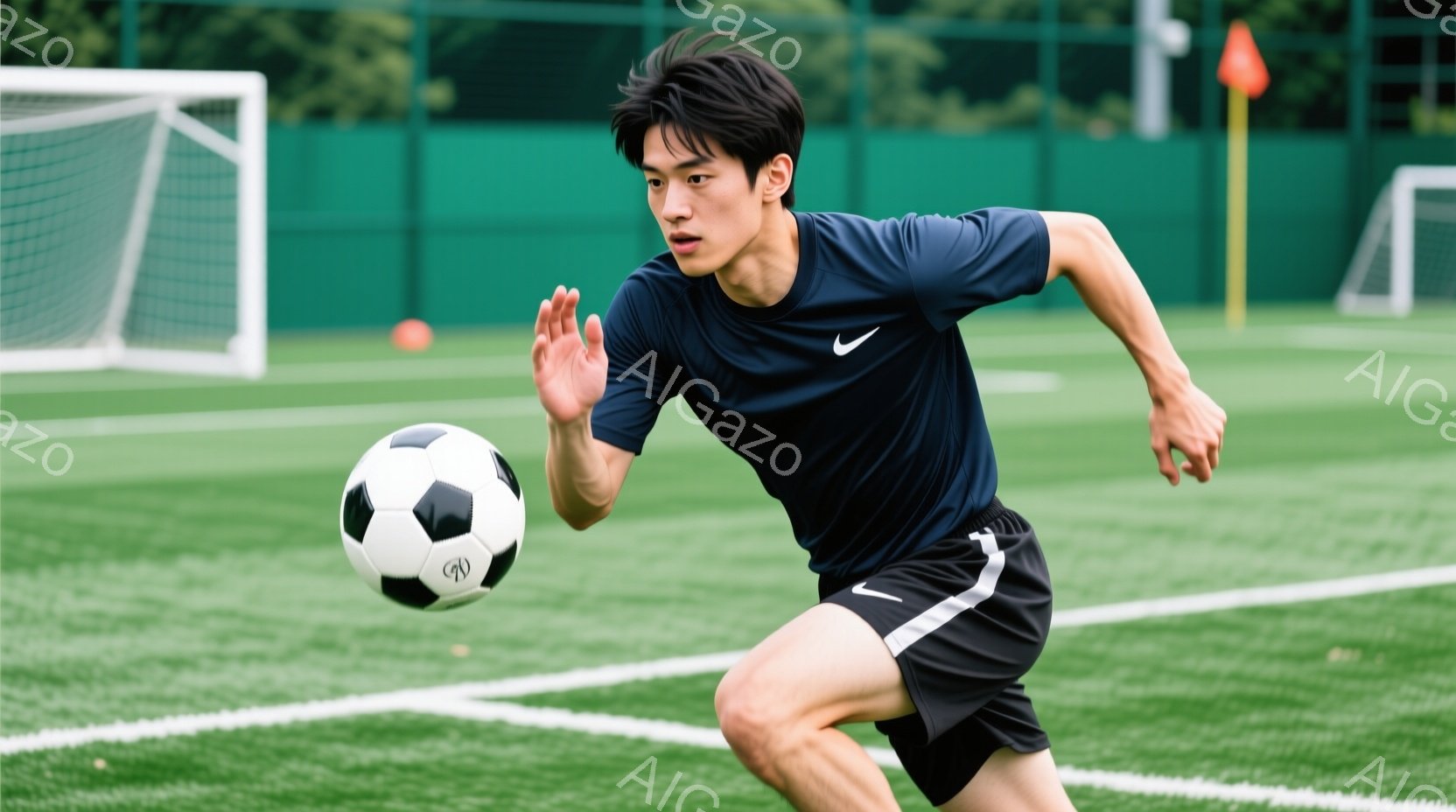 黒いサッカーユニフォームを着た若い男性が、緑の芝生の上をボールをドリブルしながら走っている。彼の髪は短く、顔は真剣な表情で、集中してボールを見つめている。背景にはサッカーゴールが見え、晴れた日の屋外でのトレーニング風景が広がっている。
