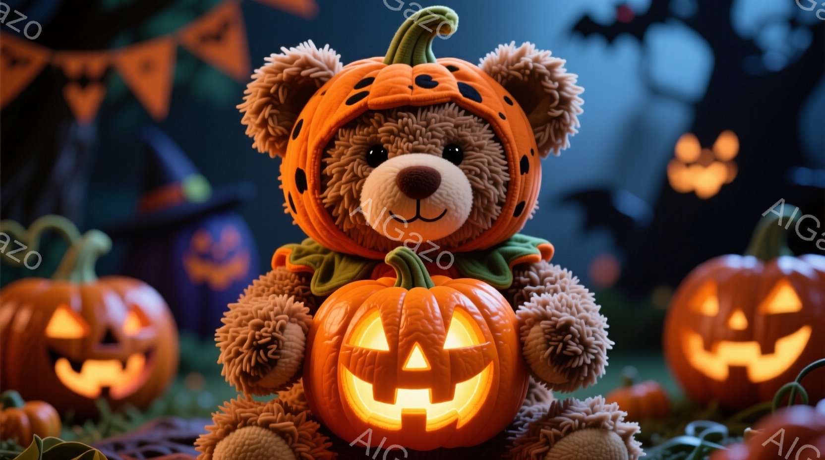 ふわふわの茶色のテディベアが、光るジャック・オー・ランタンを抱きかかえています。背景には、様々な大きさの他のジャック・オー・ランタンが並び、夜空には満月が輝いています。全体的にハロウィーンの暖かい雰囲気で、可愛らしい光が印象的です。
