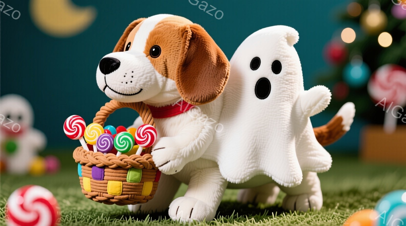 茶色と白の毛並みの可愛らしい子犬が、カラフルな編みかごいっぱいのキャンディーを持って座っています。隣にはふわふわの白い幽霊のぬいぐるみが寄り添い、子犬は少し前を見つめています。背景は緑の芝生で、キャンディーや風船が散りばめられており、ハロウィーンのようなお祭り気分を演出しています。