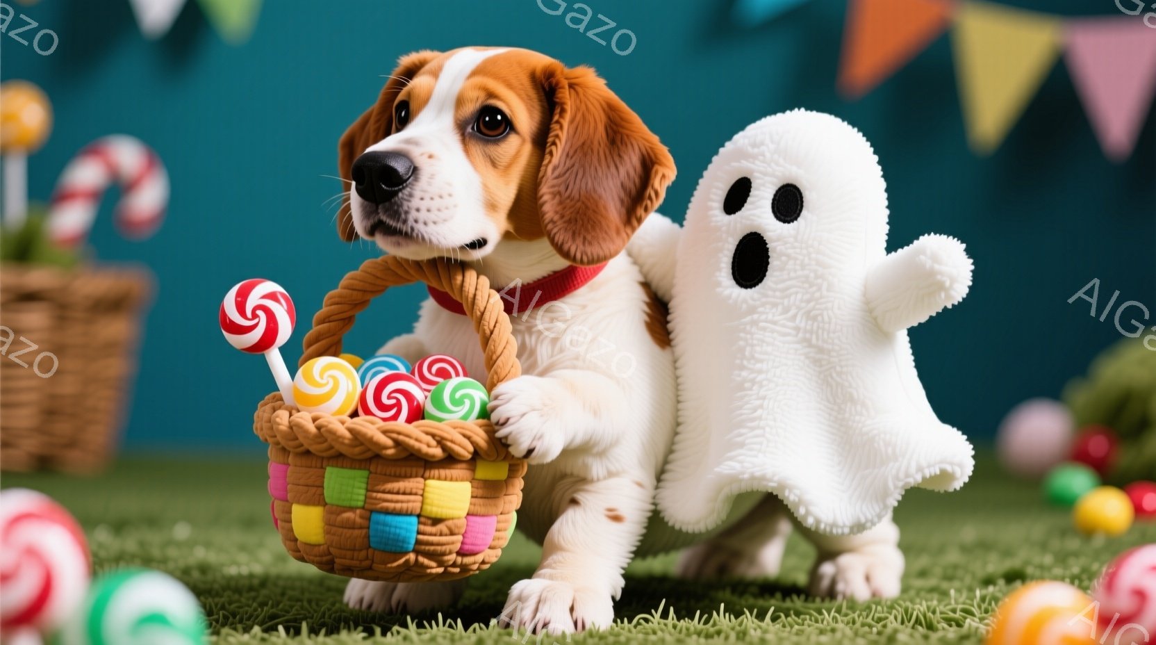 茶色と白のビーグル犬が、ハロウィーンの仮装で幽霊のコスチュームを着ています。犬は片方の前足で編まれたバスケットを持っており、中にはカラフルなキャンディが入っています。背景には緑の草地が広がり、ぼやけた黄色い光が点在しており、お祭り騒ぎの楽しい雰囲気が漂います。