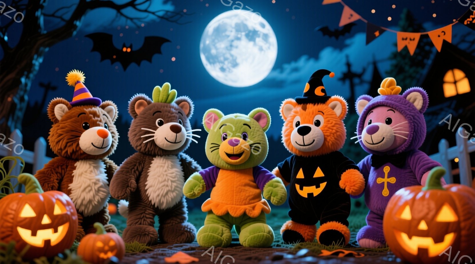 ハロウィーンをテーマにした画像で、様々な動物のぬいぐるみたちが衣装を着て並んでいます。背景には満月とコウモリ、そしてジャック・オ・ランタンが散りばめられており、少し不気味ながらも楽しい雰囲気が漂っています。ぬいぐるみたちはそれぞれ異なる仮装をしており、お祝いの準備をしている様子が伺えます。