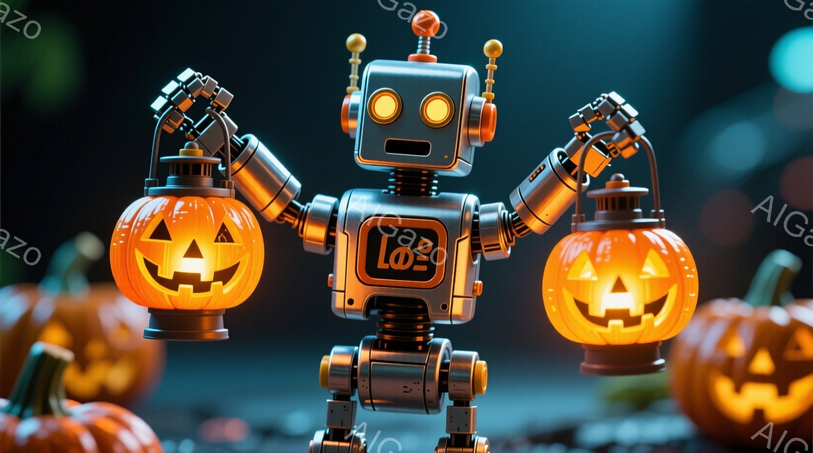 古風なロボットが、両手にジャック・オー・ランタンを持って立っています。ロボットは金属製のボディで、頭部にはいくつかのダイヤルとデジタルディスプレイが組み込まれています。背景にはぼやけたオレンジ色のカボチャが浮かび、薄暗い緑色の植物が生い茂り、ハロウィーンの夜の不思議な雰囲気を醸し出しています。