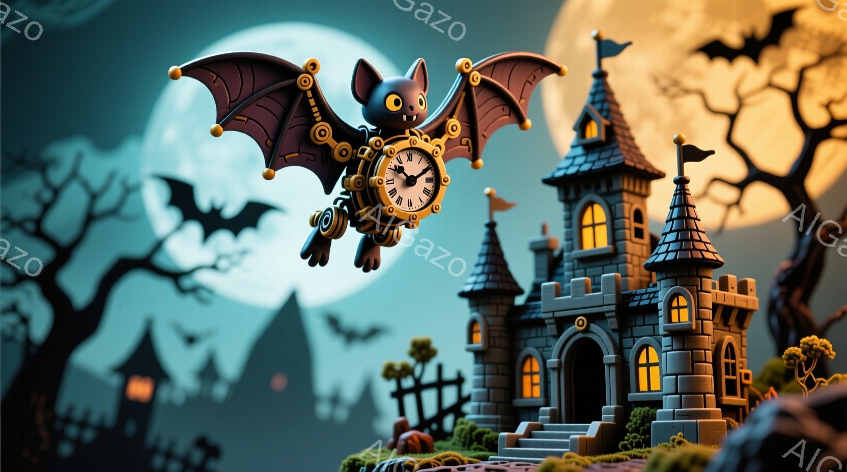 暗い夜空を背景に、おとぎ話のようなお城と、時計仕掛けのコウモリが描かれています。お城は灰色で、塔や窓から光が漏れ、可愛らしい雰囲気です。背景にはシルエットの木々が立ち並び、全体的に幻想的で少し不気味なハロウィーンの雰囲気です。