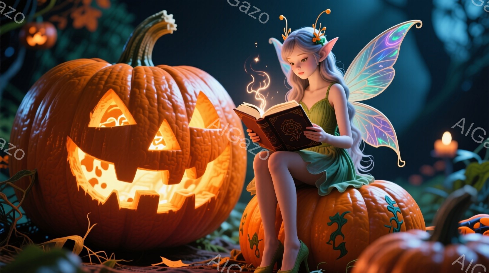 少女は、かぼちゃの巨大な彫刻に囲まれ、足元はむき出しで座って本を読んでいます。エメラルドグリーンのドレスを身に着け、巻き毛の髪には花飾りをつけており、顔は真剣な読書に集中しています。背景は暗い森で、光るかぼちゃが配置され、神秘的で幻想的な雰囲気を醸し出しています。
