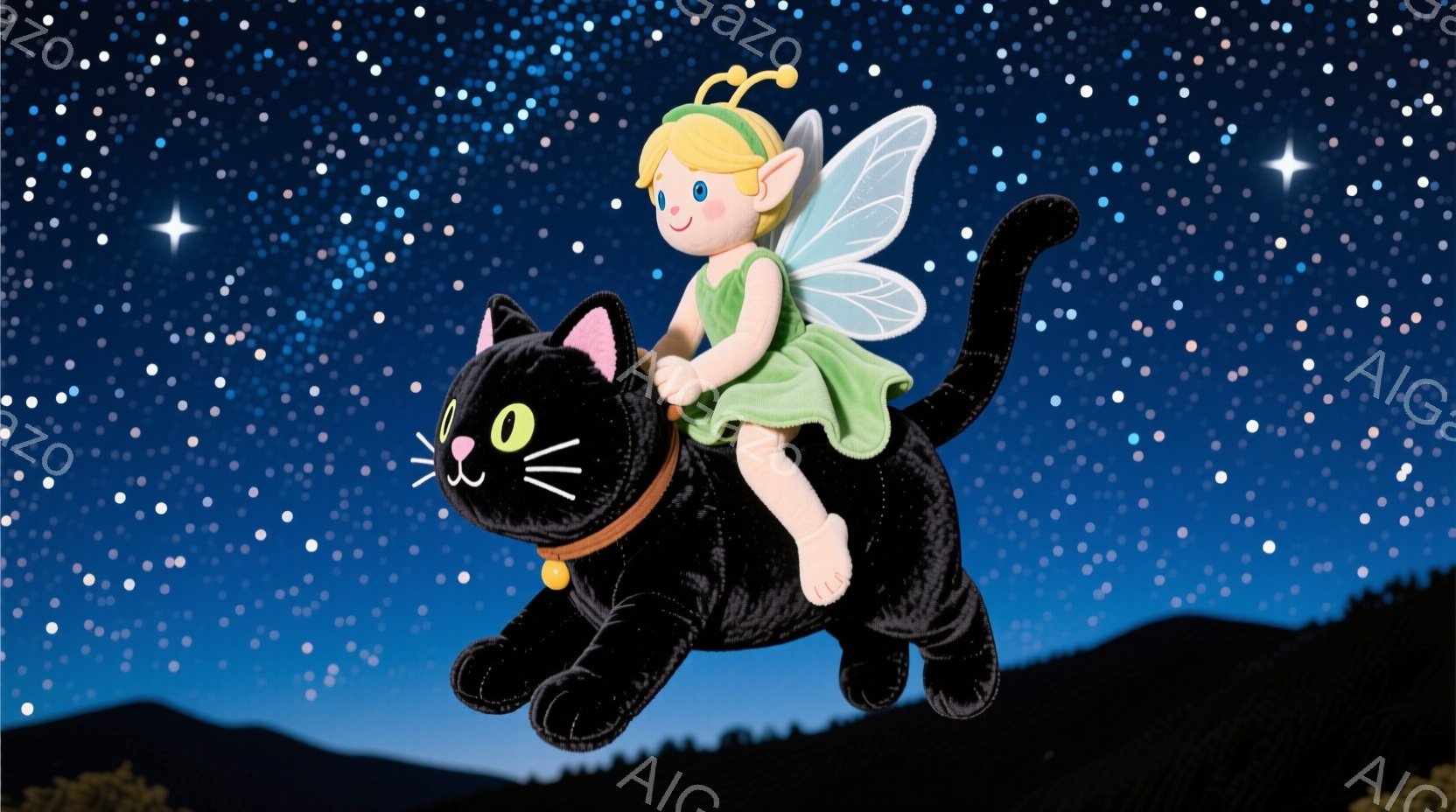 真っ黒な猫の背中に、緑色のドレスを着た小さな妖精が乗っています。妖精は金髪の髪にピンク色の頬を持ち、楽しそうに微笑んでいます。背景は夜空で、星が輝き、遠くにはシルエットになった丘や木々が見えます。