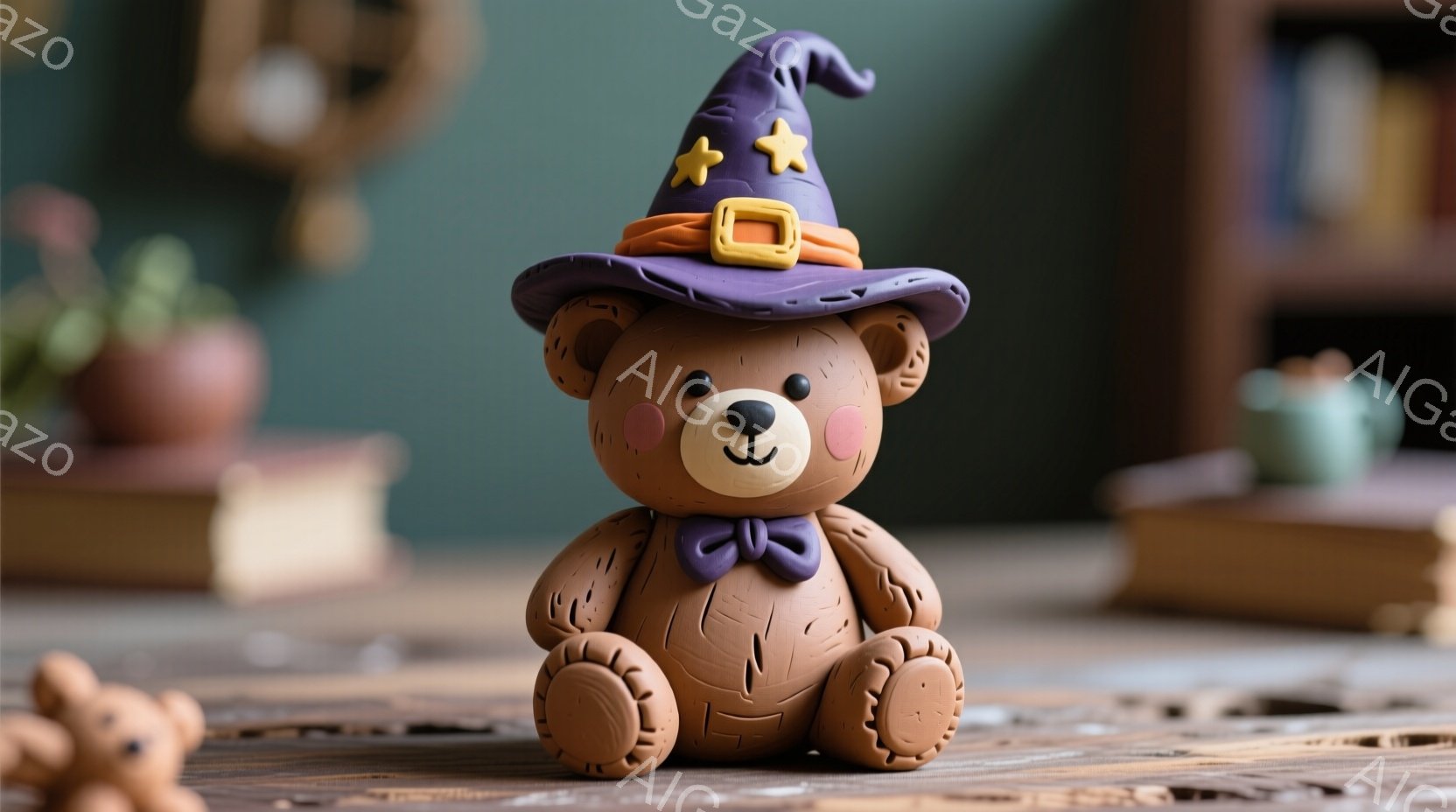 粘土のような質感の茶色のクマの人形が、ハロウィーン風の帽子と蝶ネクタイをつけて座っています。背景には、かぼちゃのランタン、緑色の茎のついたかぼちゃ、そしてハロウィーンらしい家がぼんやりと見え、落ち葉が散らばっています。全体的に、ハロウィーンの楽しい雰囲気が漂う、可愛らしいシーンです。