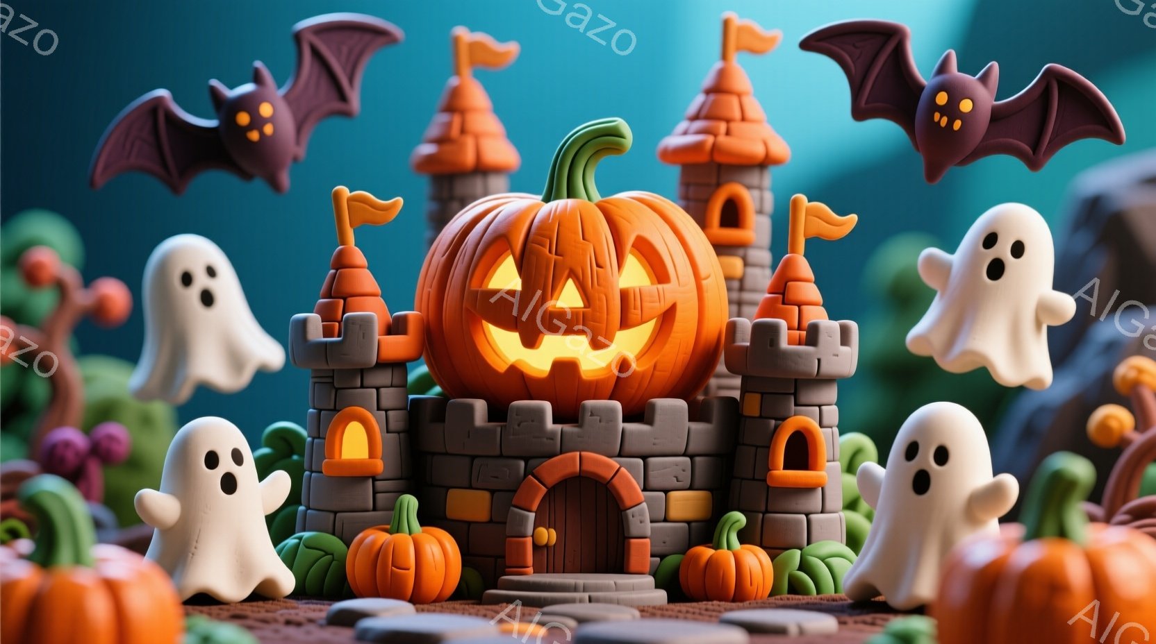 ハロウィーンをテーマにした可愛らしい粘土のような世界が描かれています。カボチャの形をした塔を持つお城を中心に、幽霊やコウモリ、様々なカボチャが配置されています。背景には暗い森が広がり、全体的に楽しいお祝いの雰囲気です。