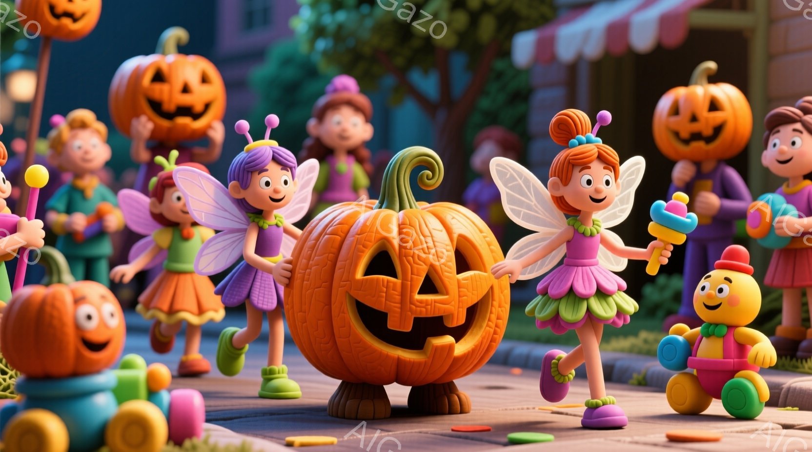 ハロウィーンのパレードの様子が描かれており、緑色のドレスを着た妖精の女の子が、紫色の靴を履いて元気よく歩いています。背景には、かぼちゃの飾り付けがされた建物や、様々な仮装をした人々が見え、カラフルで賑やかな雰囲気が漂っています。全体的に、明るい日差しの中で、子供たちがハロウィーンを楽しむ様子が表現されています。