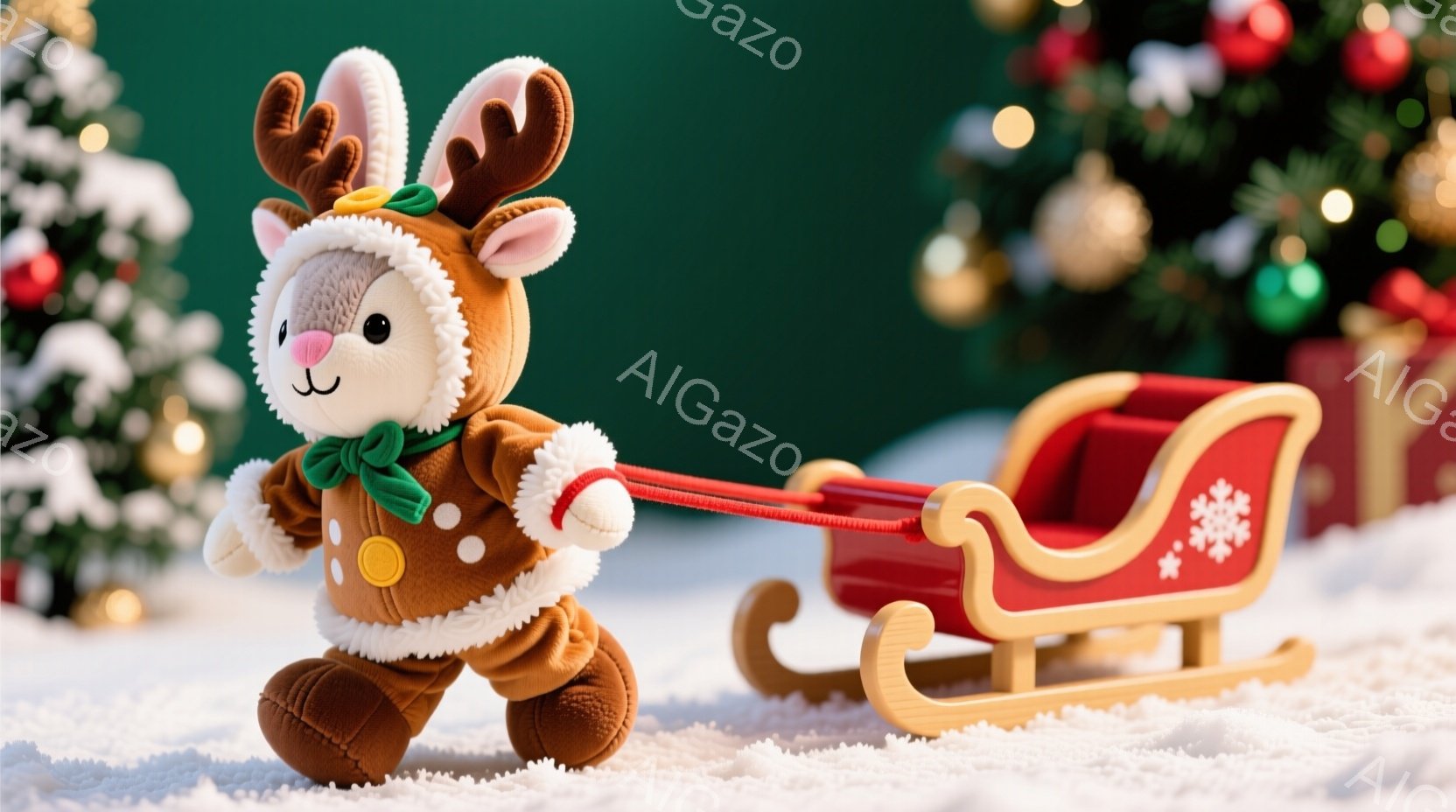 茶色いぬいぐるみがトナカイの衣装を着て、赤いソリを引いています。衣装には角、緑色のリボン、そして胸元に大きな白い円があります。背景にはクリスマスツリーやプレゼントがあり、雪景色の中で温かく、楽しい雰囲気が漂っています。