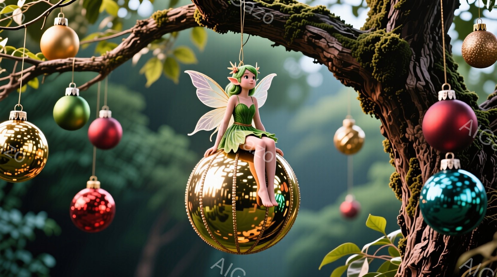 緑色のドレスを着た小さな妖精が、水色と緑の模様が入った大きな球体の上に座っています。彼女は金色の髪と緑色の目を持ち、少し微笑んでいます。背景にはクリスマスオーナメントが飾られた枝があり、全体的に幻想的で温かいクリスマスの雰囲気が漂っています。