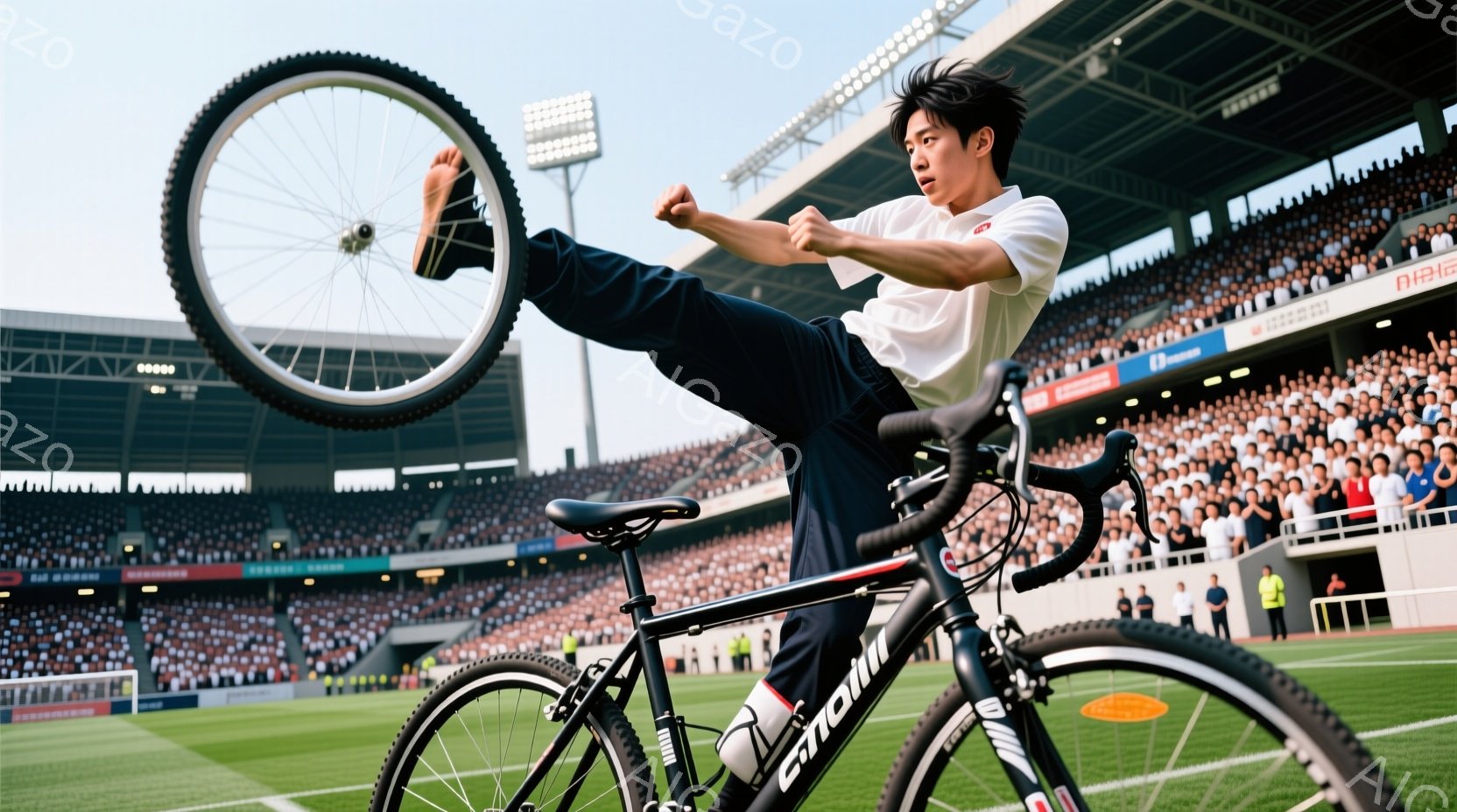 白いTシャツと黒いパンツを身につけた若い男性が、緑の芝生の上に置かれたマウンテンバイクの上で、片足を大きく上げてジャンプしています。彼は黒いヘアスタイルで、顔には決意と興奮が混じった表情が見られます。背景には満員の観客席と、広告が入った壁があり、競技場のような賑やかな雰囲気です。