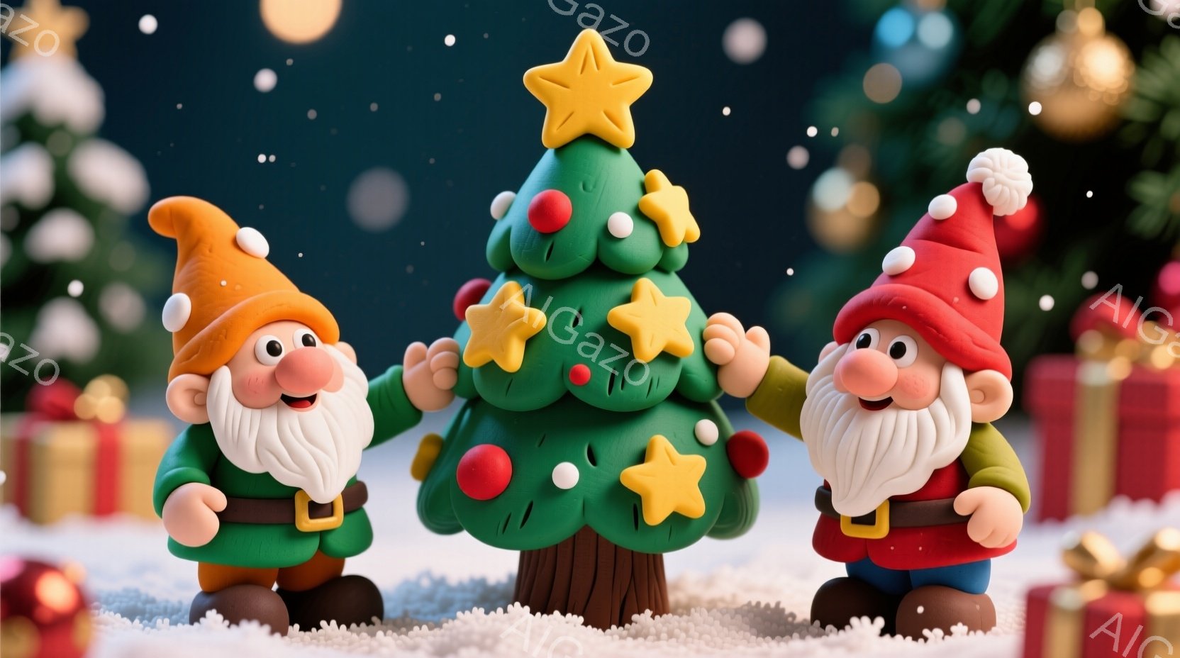 4人の小人が緑色のクリスマスツリーの周りに集まり、楽しそうにツリーを飾り付けている。彼らはそれぞれ赤い帽子と白いひげを持ち、緑と茶色の服装を着ている。背景には雪景色と、他のクリスマスツリーやプレゼントが見え、全体的に暖かくお祝いムードに満ちた雰囲気である。