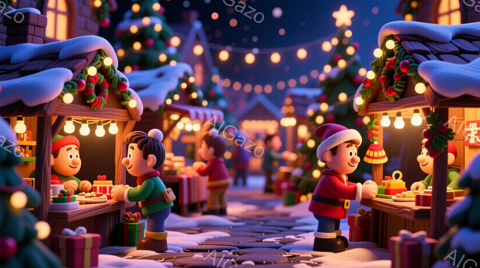 クリスマスのマーケットの賑やかな様子を描いています。人々は厚手のジャケットや帽子を身につけ、プレゼントが積み上げられた屋台の周りに集まっています。背景には、雪で覆われた建物と、きらめくイルミネーションが広がり、温かく、お祝いムードに満ちた雰囲気を醸し出しています。