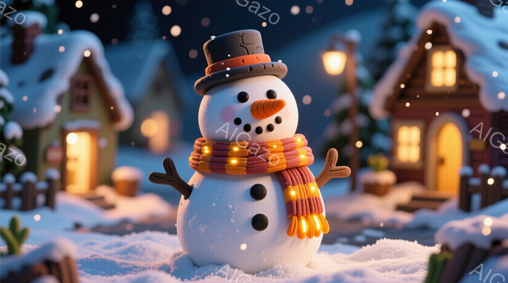 雪だるまが画面中央に位置し、頭にはシルハット、鼻にはにんじんがついています。オレンジとベージュの縞模様のスカーフを巻き、枝で作られた腕とボタンでできた表情が愛らしいです。背景には、ライトが点灯した可愛らしい家々が並び、雪が降り積もる静かで温かい冬の夜の雰囲気を感じさせます。