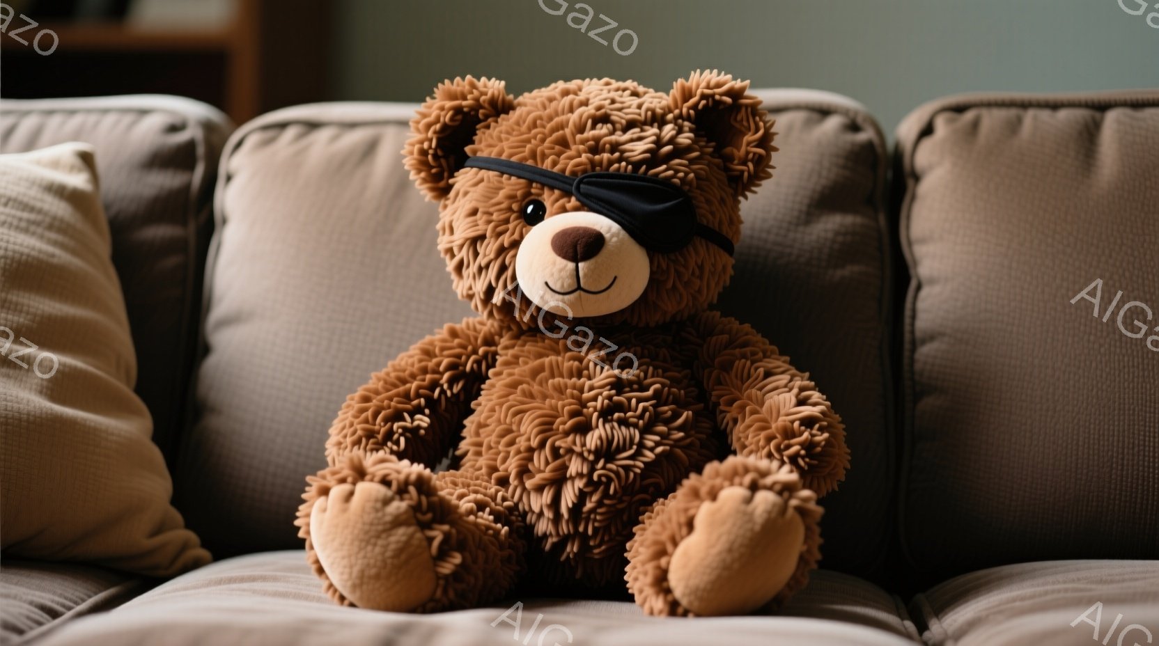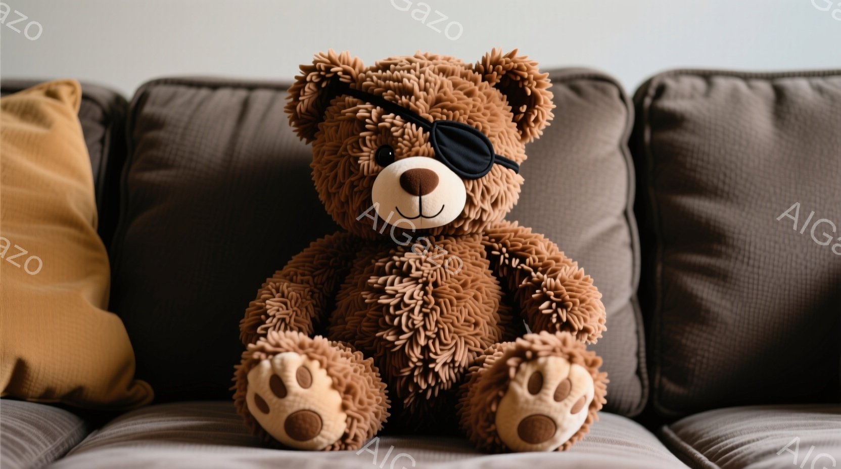 チョコレート色のモフモフしたテディベアが、茶色のクッションの上に座っています。片目に眼帯をしており、どこかいたずらっぽい表情をしています。背景には、同じ茶色のクッションが並び、暖かく穏やかな雰囲気が漂っています。