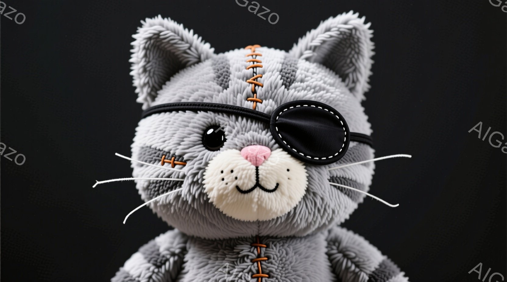 灰色のモフモフした猫のぬいぐるみのお顔が大きく写っています。片方の目が黒い眼帯で覆われ、縫い目のようなステッチが猫の体に施されています。背景は真っ黒で、ぬいぐるみが際立っており、少し不気味ながらも可愛らしい雰囲気を醸し出しています。