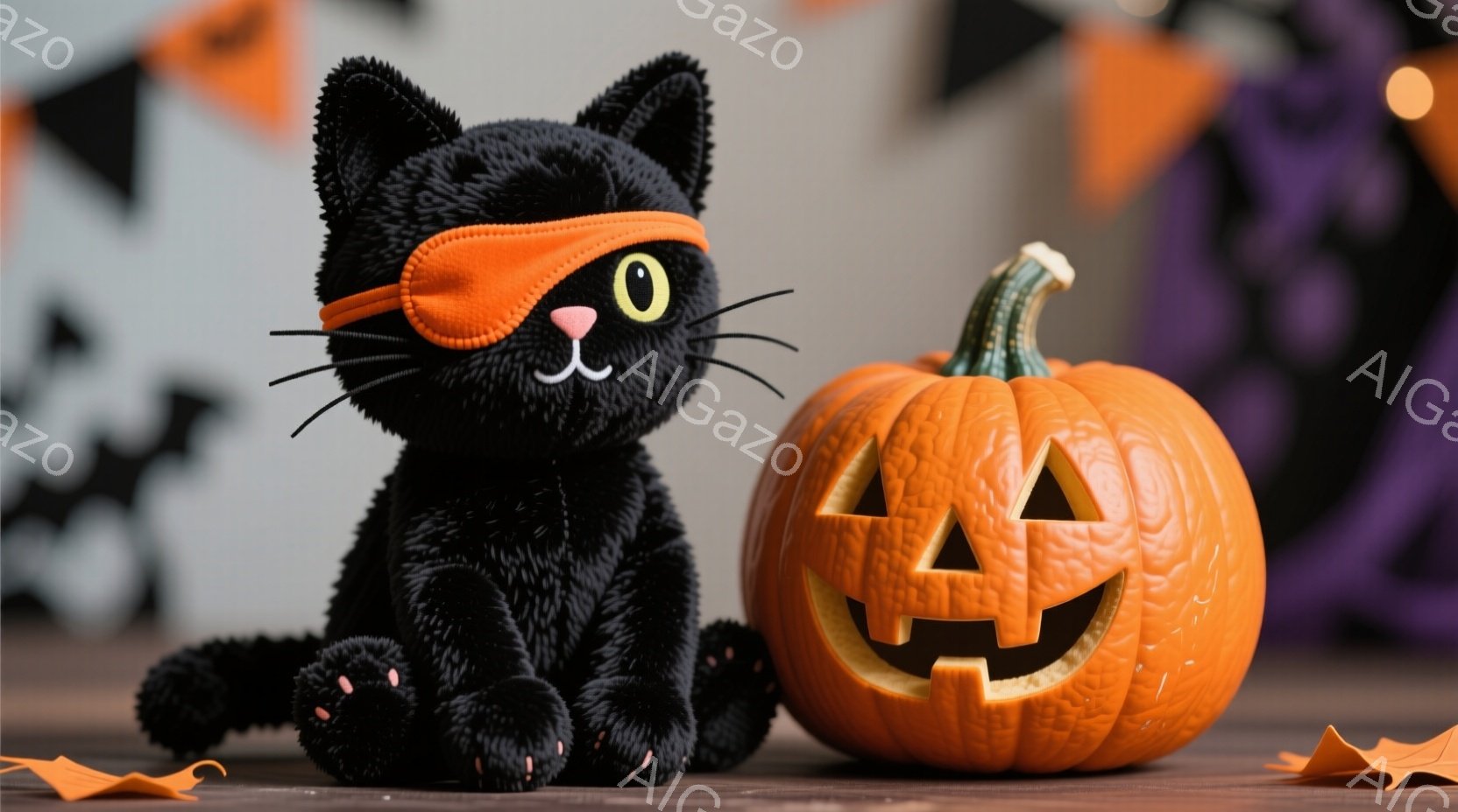 黒いぬいぐるみの猫が、片目にオレンジ色の眼帯をして、右手を上げています。背景は水色の壁で、ハロウィーンを象徴するカボチャの飾りと、オレンジと黒の旗が飾られています。全体的に、ハロウィーンの楽しい雰囲気を醸し出しています。