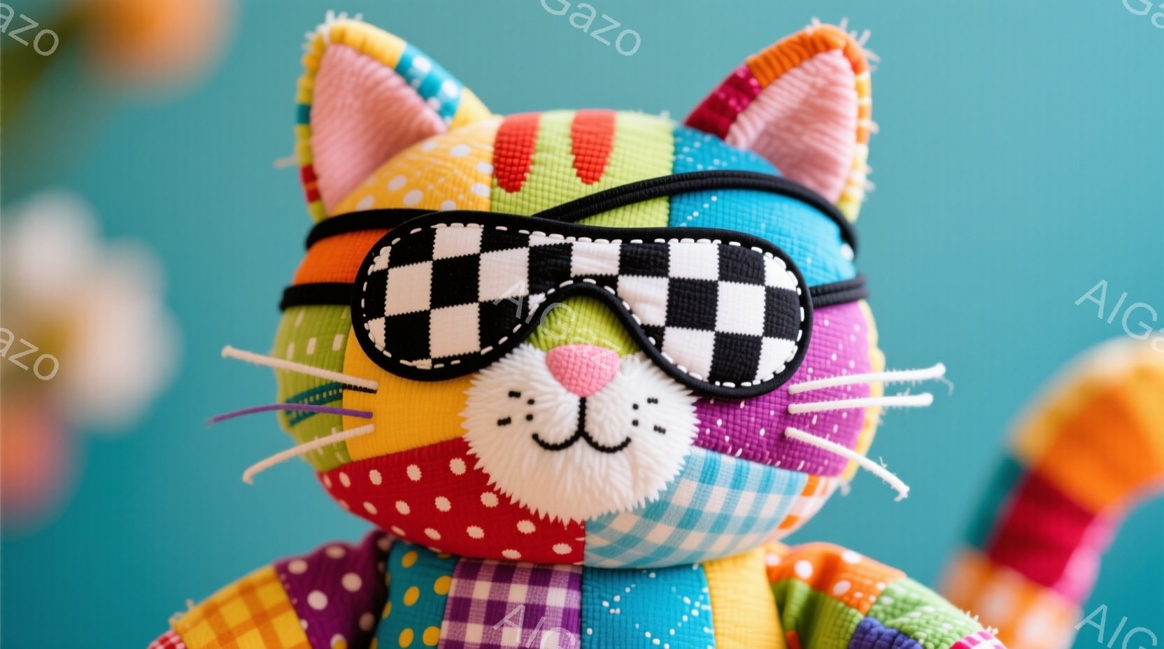 カラフルなパッチワークで作られたテディベアが写っています。黒いチェック柄のサングラスをかけ、白いひげと赤い口元が可愛らしい表情を作り出しています。背景は水色の壁に花柄の模様があり、全体的に明るく遊び心のある雰囲気です。