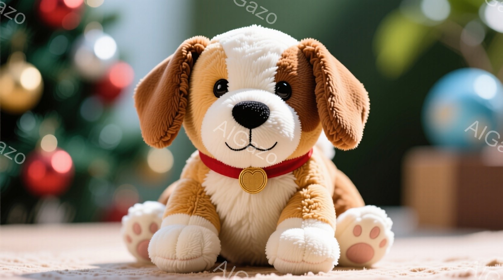 茶色と白の毛並みを持つプーチのようなぬいぐるみ犬が写っています。赤い首輪を付けており、床のカーペットの上でリラックスした姿勢で前足を伸ばして横たわっています。背景にはぼやけた家具が見え、室内で穏やかな雰囲気が漂っています。
