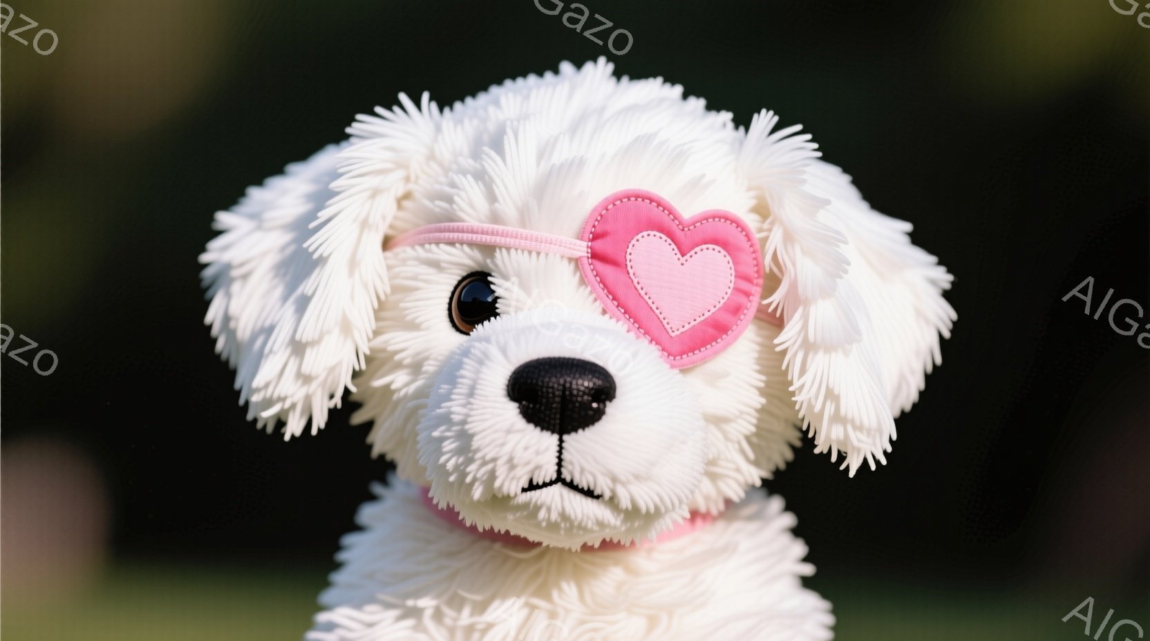 白いもふもふした犬のぬいぐるみのお顔が大きく写っています。ピンク色のハート型のパッチが片目に付いており、赤い首輪をつけています。背景は緑色のぼやけた自然で、全体的に柔らかく可愛らしい雰囲気です。