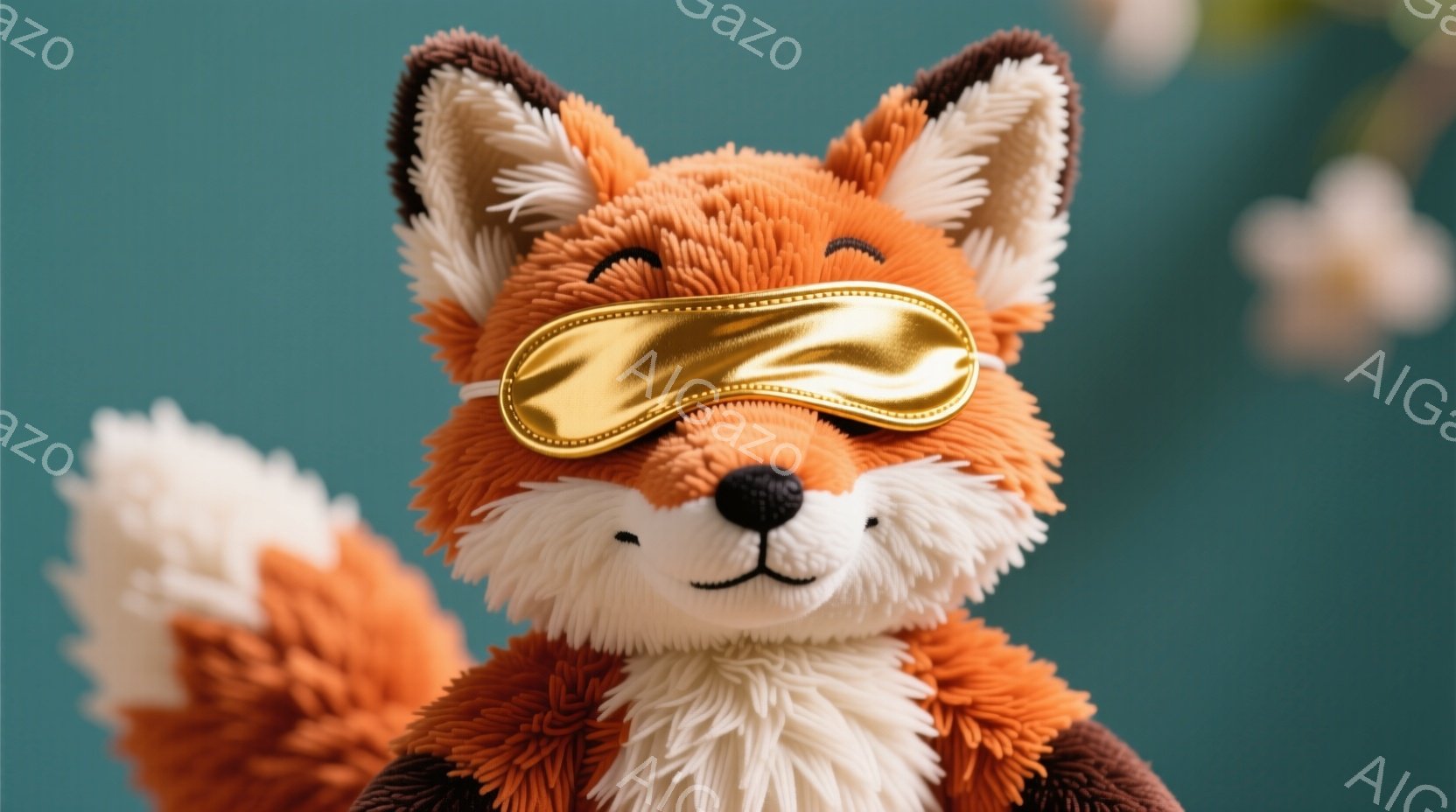 明るいオレンジ色の毛並みを持つキツネのぬいぐるみです。目は閉じられ、金色のアイマスクを着用しており、リラックスした表情をしています。背景は深い緑色で、ぬいぐるみが際立っています。