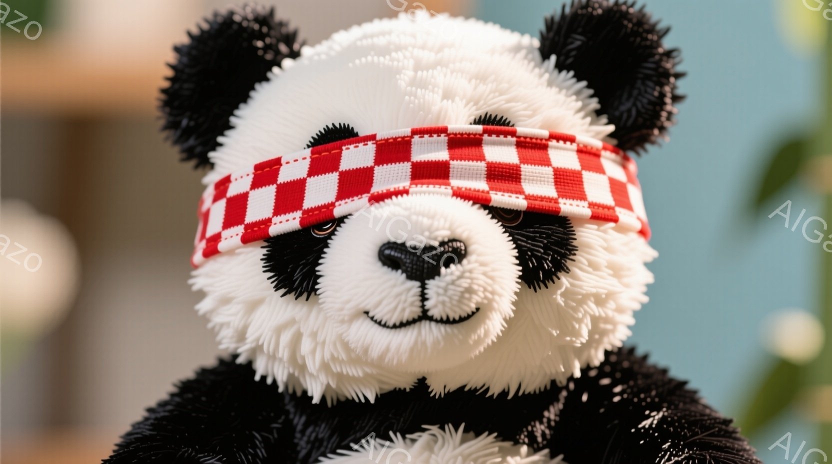 白と黒のパンダのぬいぐるみは、赤いチェック柄のヘアバンドを巻いています。ぬいぐるみは正面を見据え、穏やかな表情をしています。背景は明るい水色で、左側に緑の葉が見え、全体的に優しい雰囲気です。