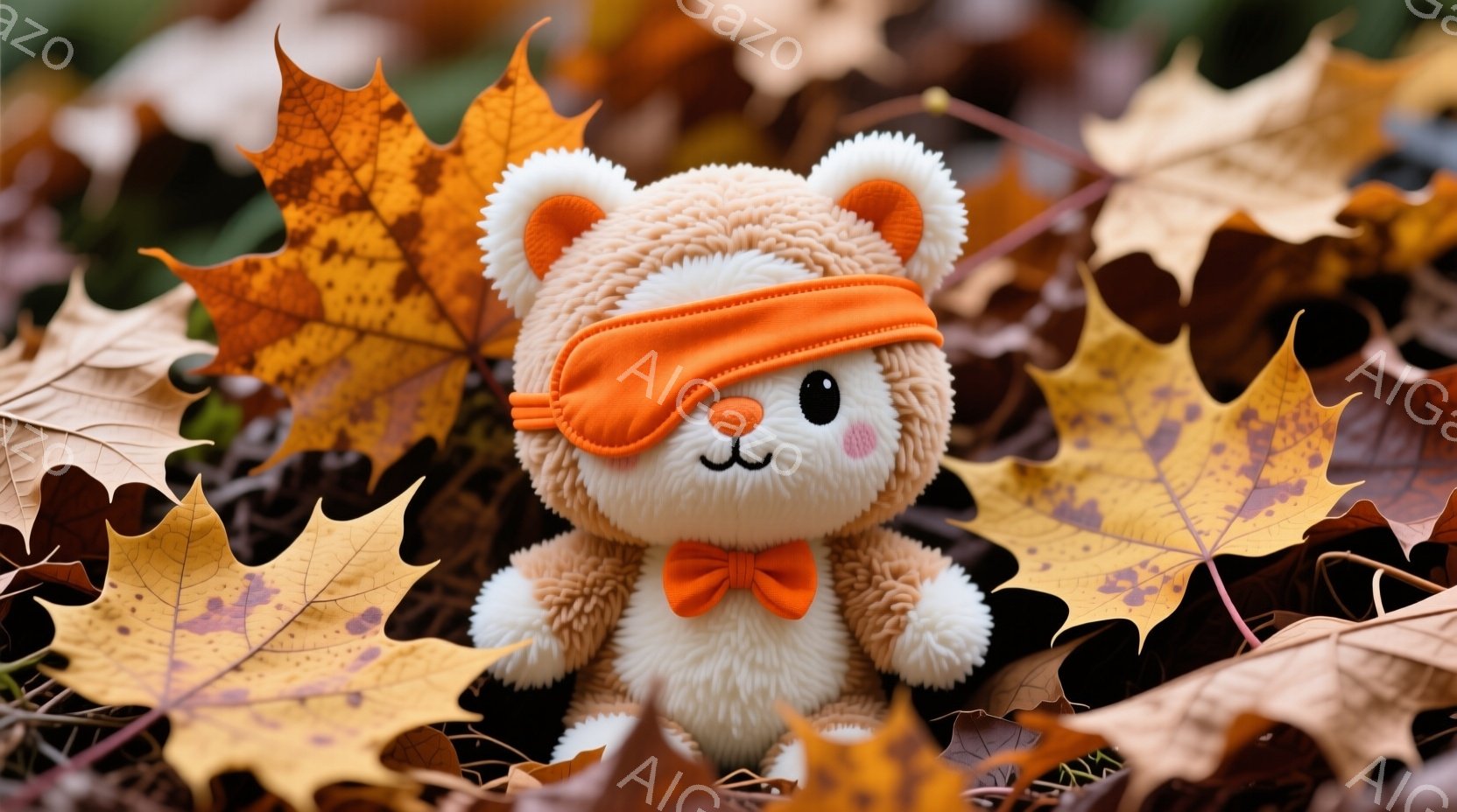 ふわふわの茶色のクマのぬいぐるみは、オレンジ色のアイマスクを着用しており、まるで眠っているかのように見えます。周囲には紅葉したカエデの葉が散りばめられており、秋の風景を演出しています。ぬいぐるみは前足を前に出し、丸みを帯びた可愛らしいポーズをとっています。