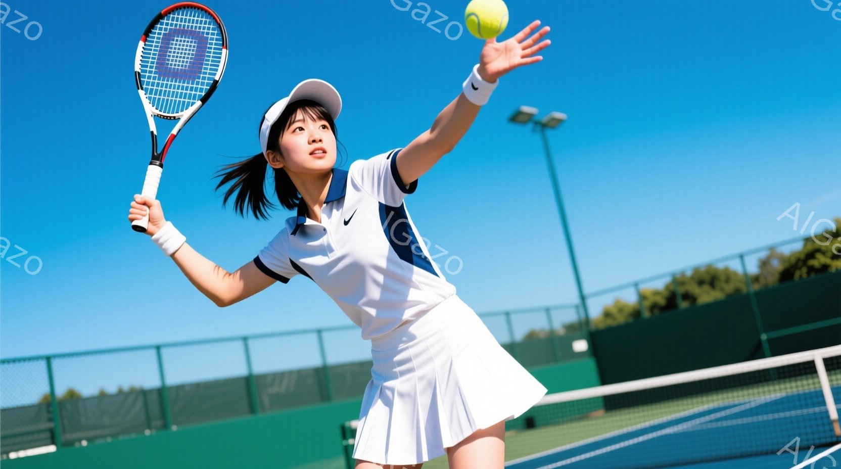 白いポロシャツとプリーツスカートを着た若い女性が、テニスボールをサーブしようとしているところです。彼女は髪をポニーテールにし、顔は上向きで集中した表情をしています。背景には緑のテニスコート、青い空、そして遠くに見える建物があり、晴れた日の屋外での活動を連想させます。