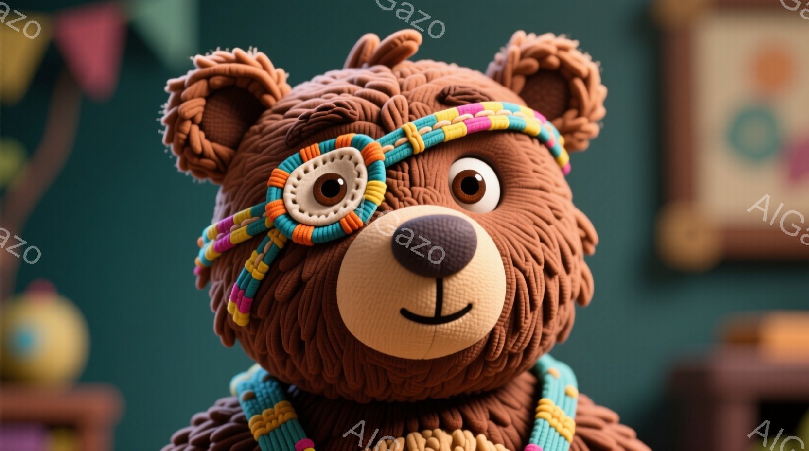 ぬいぐるみのような茶色のクマが、片目にカラフルなパッチを付けてこちらを見ています。その表情は穏やかで、柔らかい毛並みが暖かさを感じさせます。背景にはぼやけた部屋の一部が見え、全体的に優しい雰囲気の画像です。