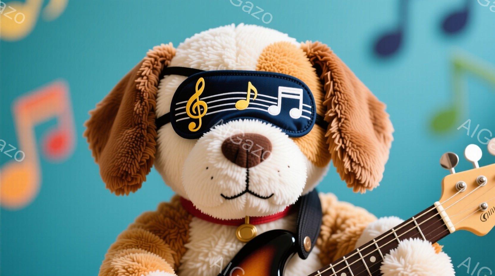 ふわふわの茶色の犬のぬいぐるみは、音楽記号が描かれた黒いヘッドバンドと赤い首輪をつけています。 ぬいぐるみはベースギターを肩に担ぎ、楽しげな表情をしています。 背景は明るい水色の壁で、様々な音楽記号が散りばめられており、陽気で遊び心のある雰囲気を醸し出しています。