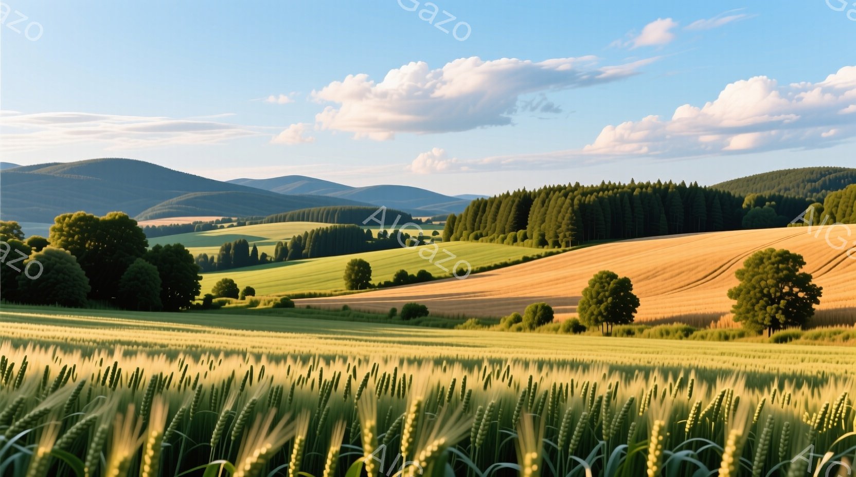 広大な緑の麦畑が広がり、その畝が遠くの丘陵地帯へと続く風景です。空は青く、白い雲が浮かび、夕暮れ時の柔らかい光が全体を包み込んでいます。背景には木々が生い茂る丘が連なり、穏やかで平和な田園風景が広がっています。
