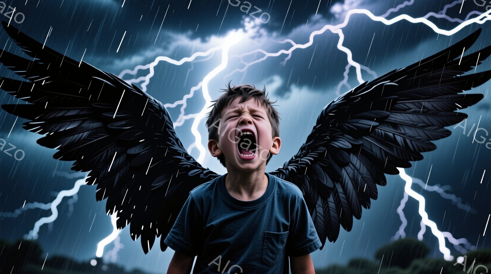 少年は灰色と黒のTシャツを着ており、髪は無造作に乱れている。彼は口を開けて叫び、背中には大きく広げられた黒い翼が生えている。背景は激しい雨と稲妻が走る暗い空で、全体的に苦悩とドラマチックな雰囲気が漂っている。
